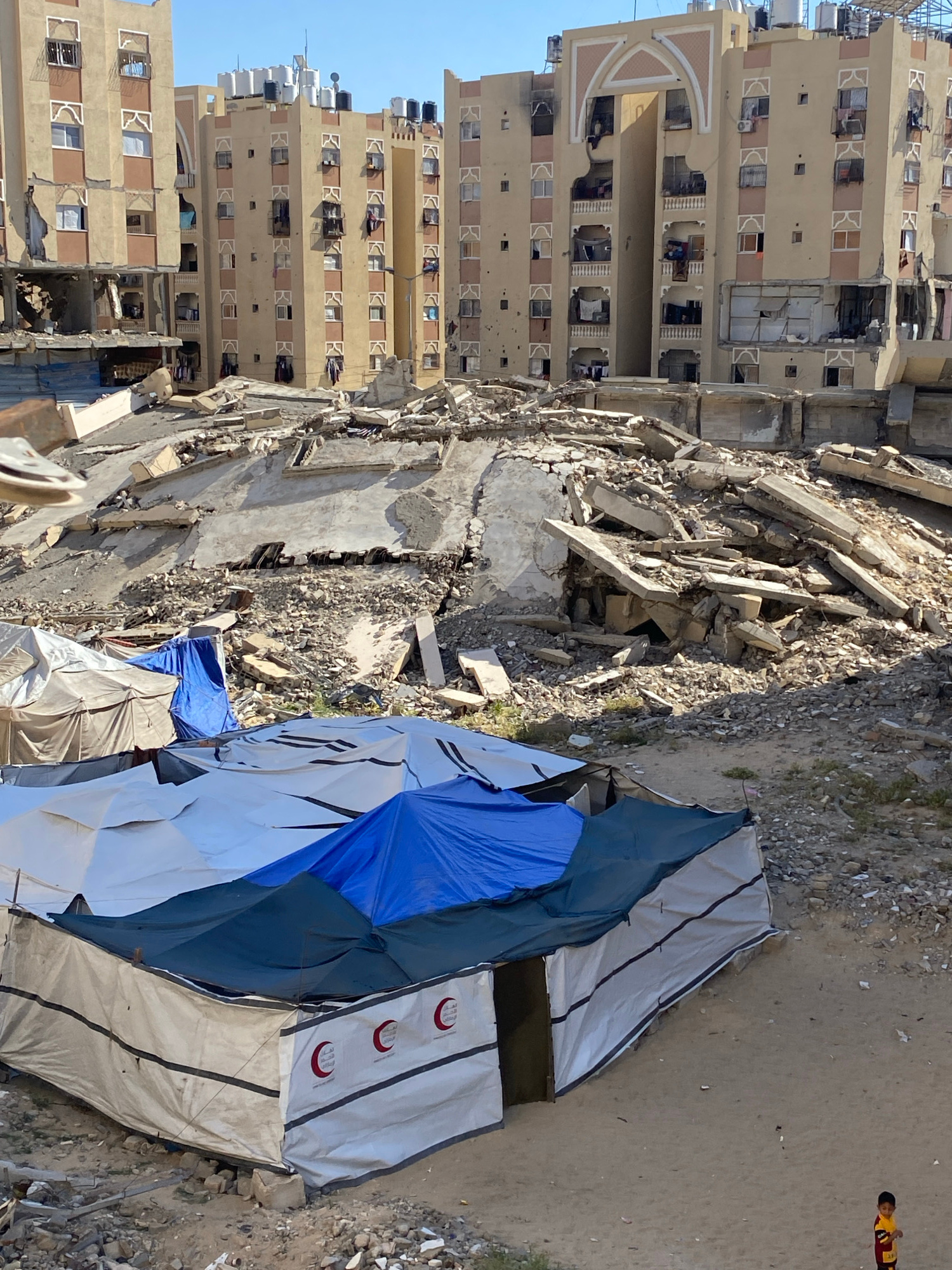 The image depicts a scene of extensive urban devastation and humanitarian makeshift shelters, likely in Khan Yunis, Palestinian Territory. In the mid-ground, a multi-story building is completely reduc…read more