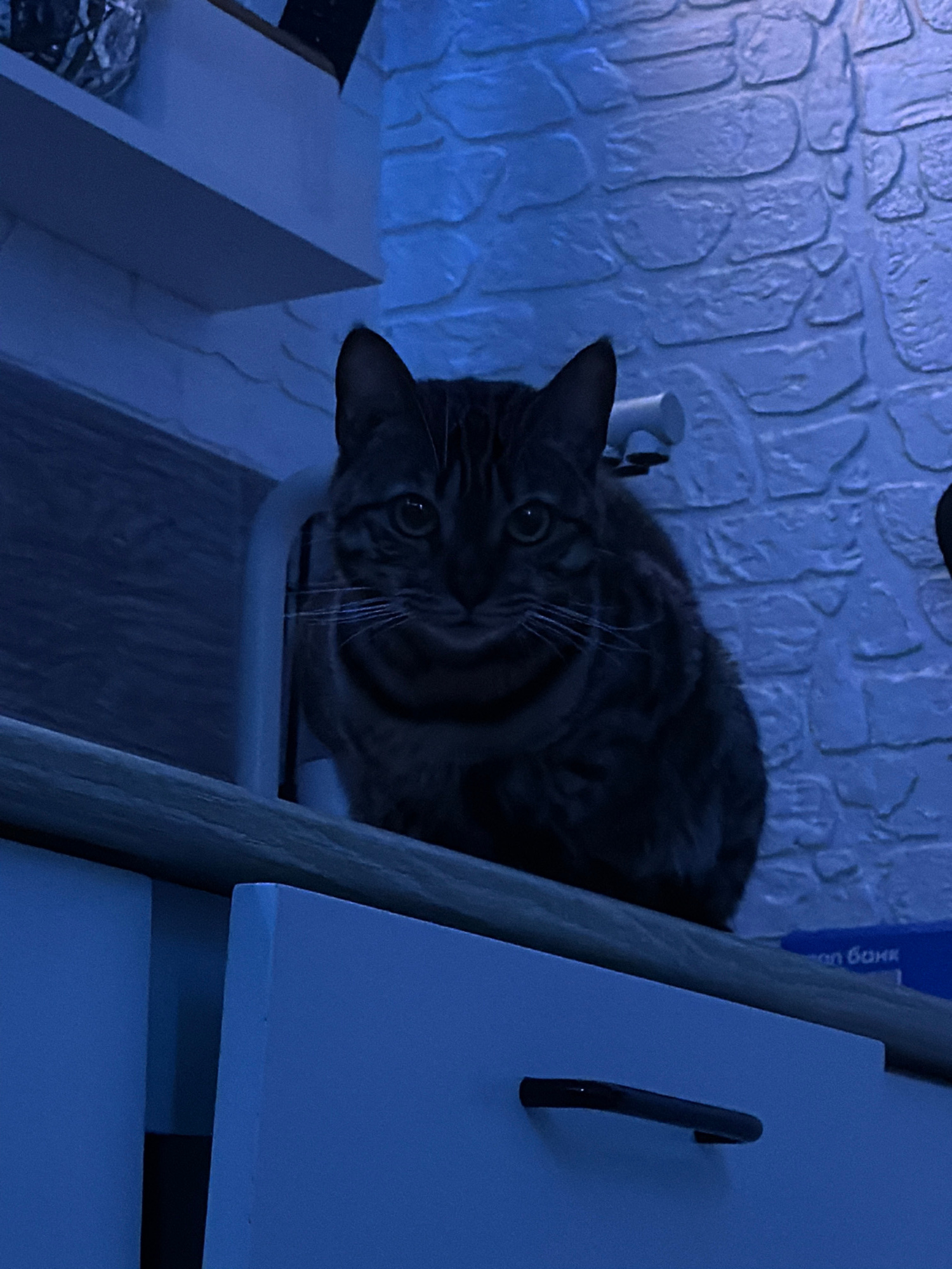 A tabby cat is perched on top of a small, white, plastic storage container situated on a white shelf. The background features a textured white wall. To the right of the cat and shelf is a wooden frame…read more