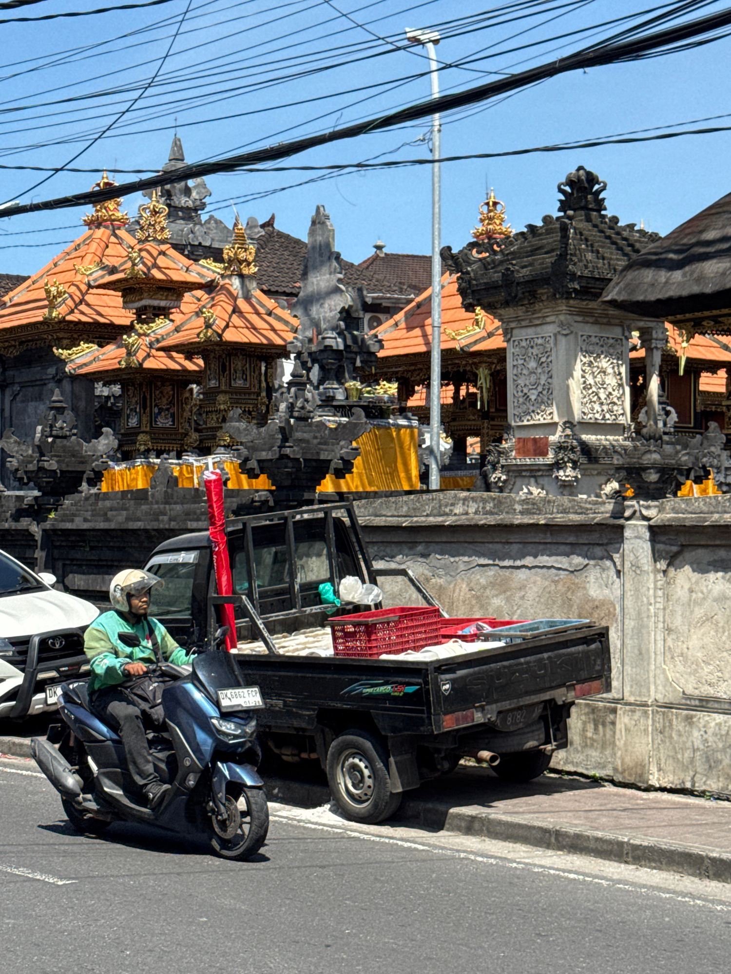 The image captures a street scene in Nusa Dua, Indonesia, featuring a Balinese temple in the background. A black pickup truck with a red cargo net stands next to the temple wall. A blue motorcycle wit…read more
