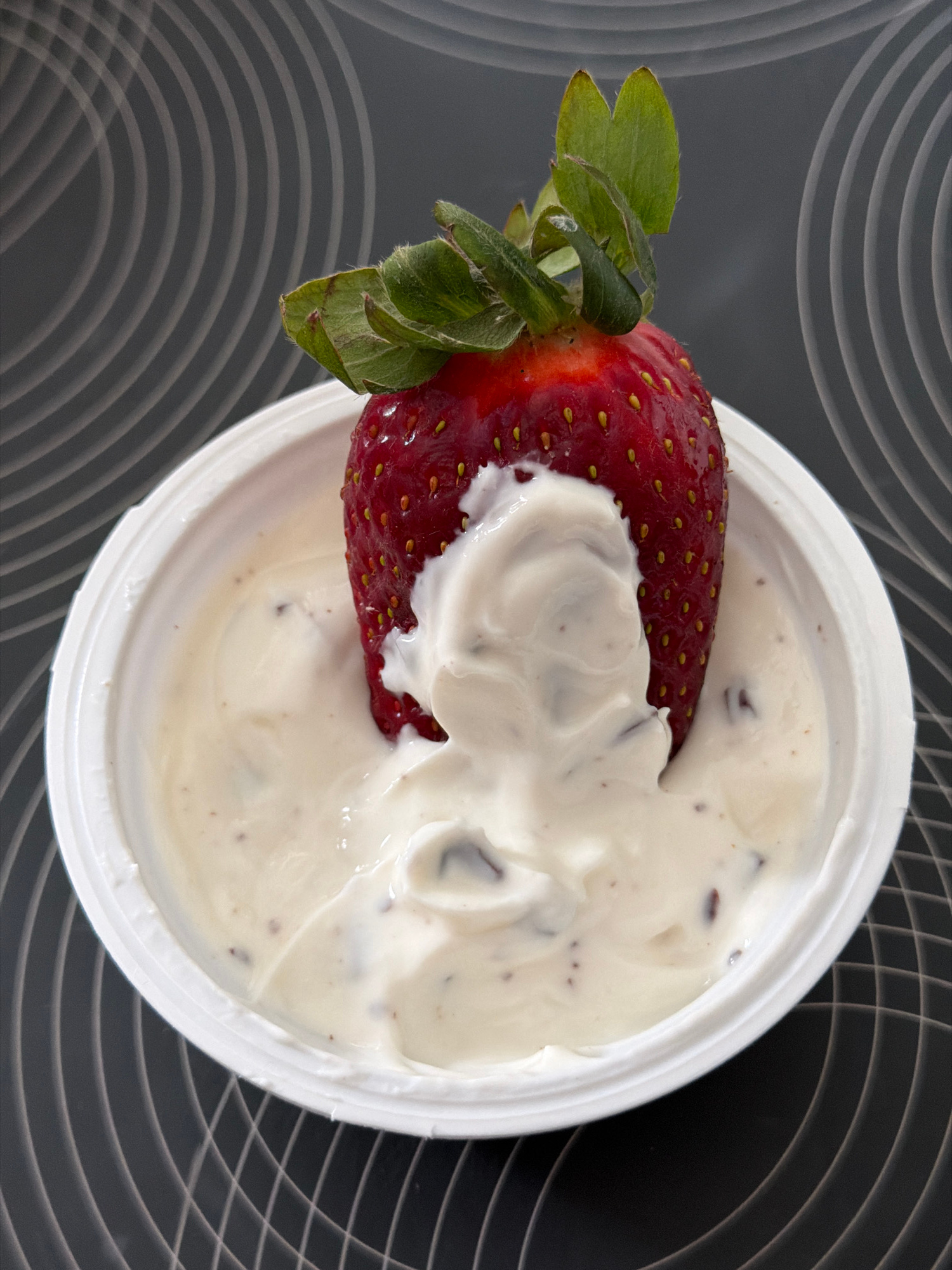 A strawberry with green leaves is dipped in a white, yogurt-like substance inside a white plastic container. The container sits on a surface with a gray, swirling pattern. The scene depicts a snack or…read more