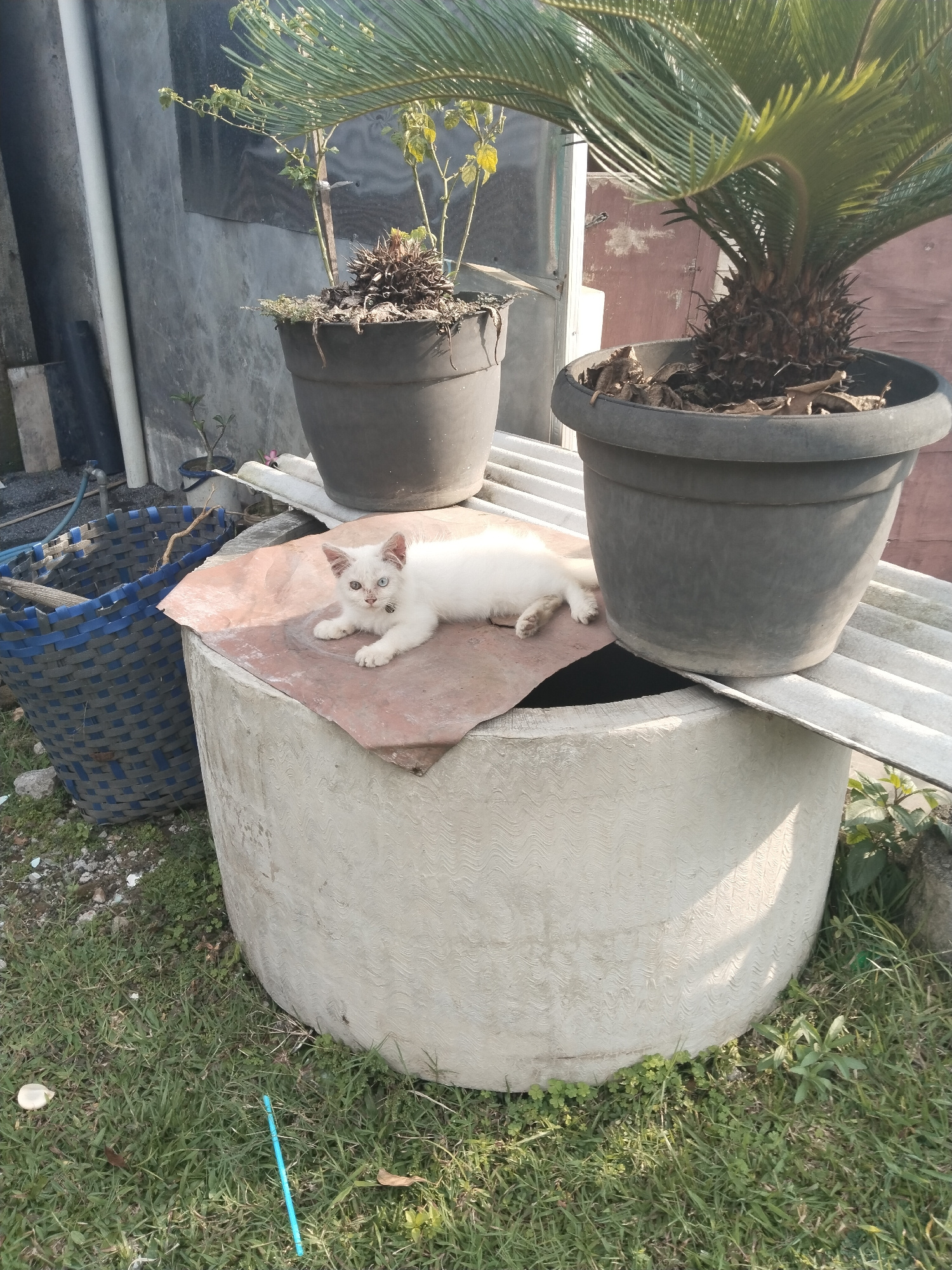 The image captures an outdoor scene in Bangsri, Indonesia, under bright daylight. The primary subject is a small, slender white cat, lying relaxed on a reddish-brown sheet. The cat possesses striking…read more