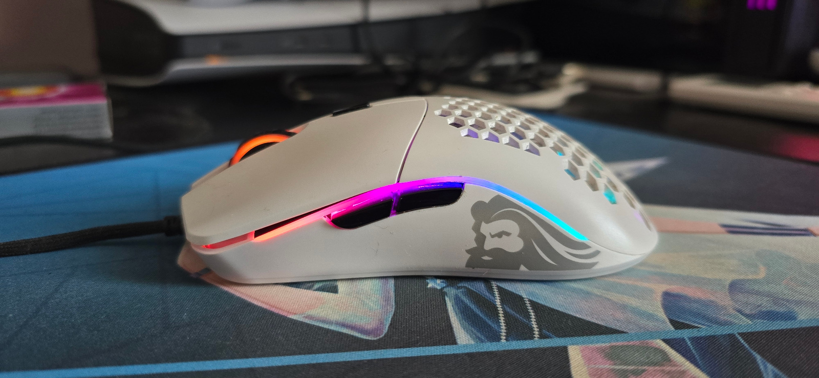 The image provides a close-up, eye-level view of a white gaming mouse resting on a patterned mouse pad. The mouse is the primary subject, illuminated by its integrated RGB lighting, which displays a g…read more