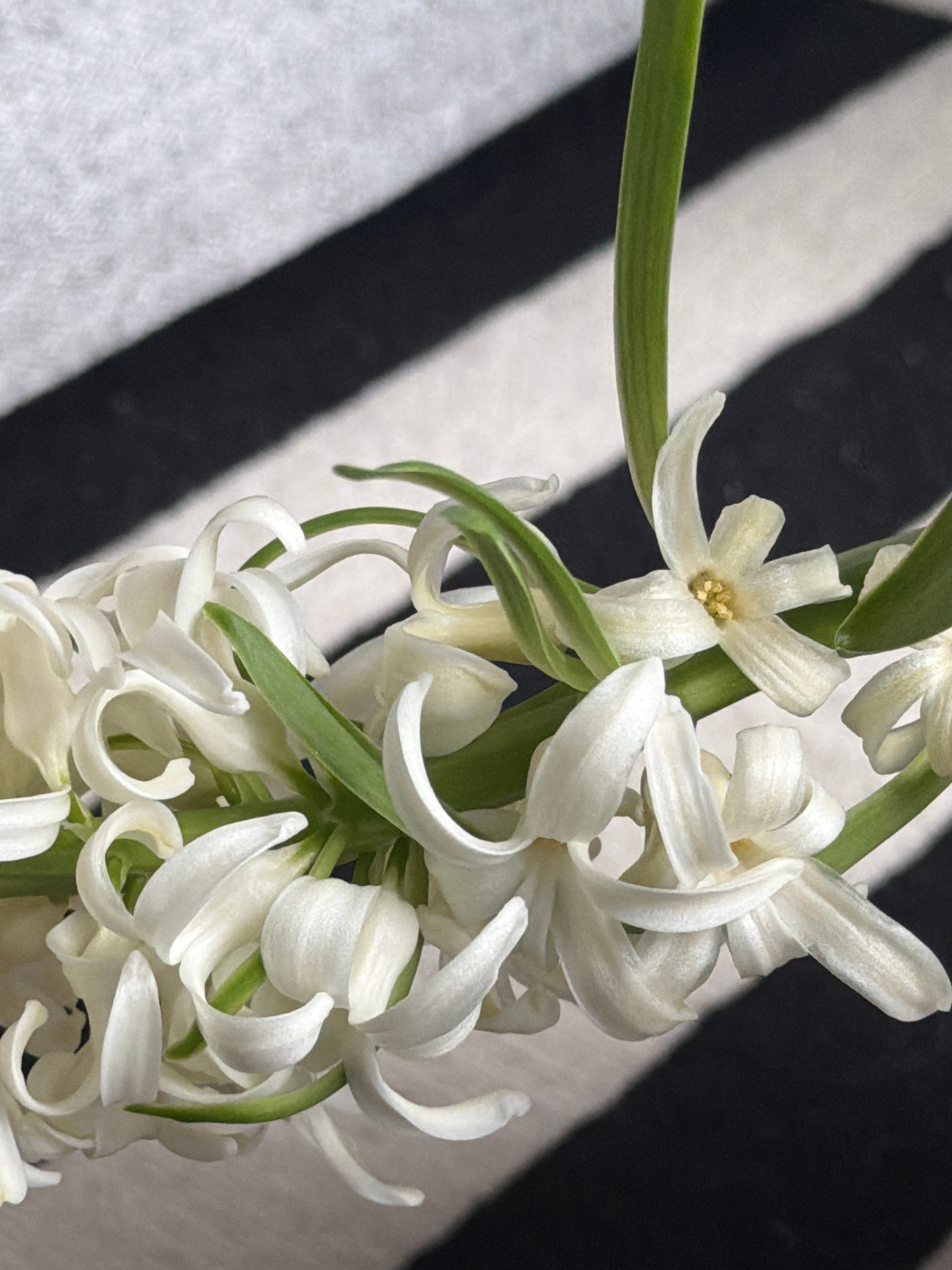 A close-up image shows a cluster of white hyacinth flowers against a black and white striped background. The flowers are in various stages of bloom, with individual petals curling and twisting. Green…read more