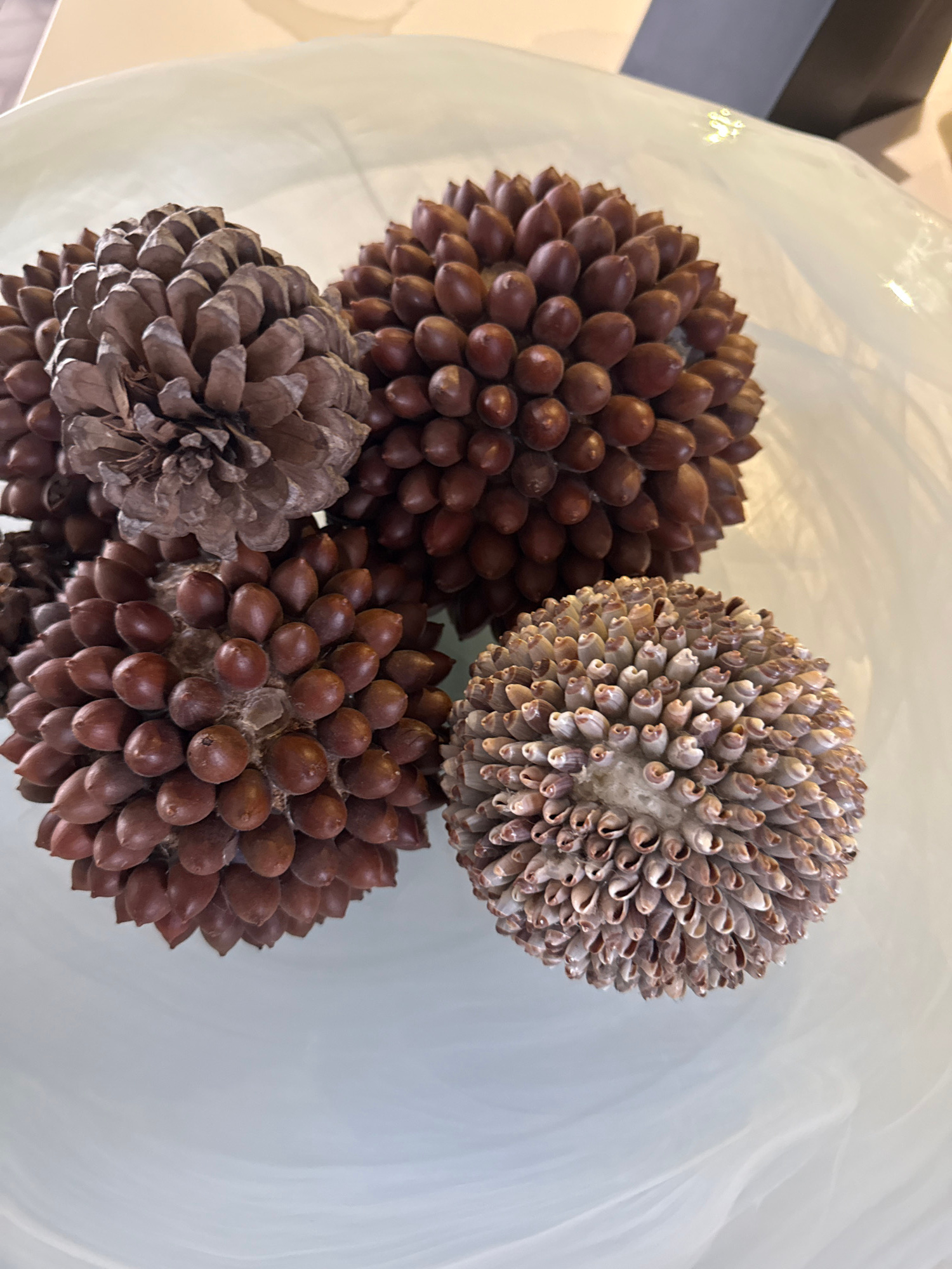 A top-down shot shows a translucent white bowl containing four spherical decorative objects. Three of the objects are brown and appear to be constructed of seed pods or nuts arranged in a dense, repet…read more