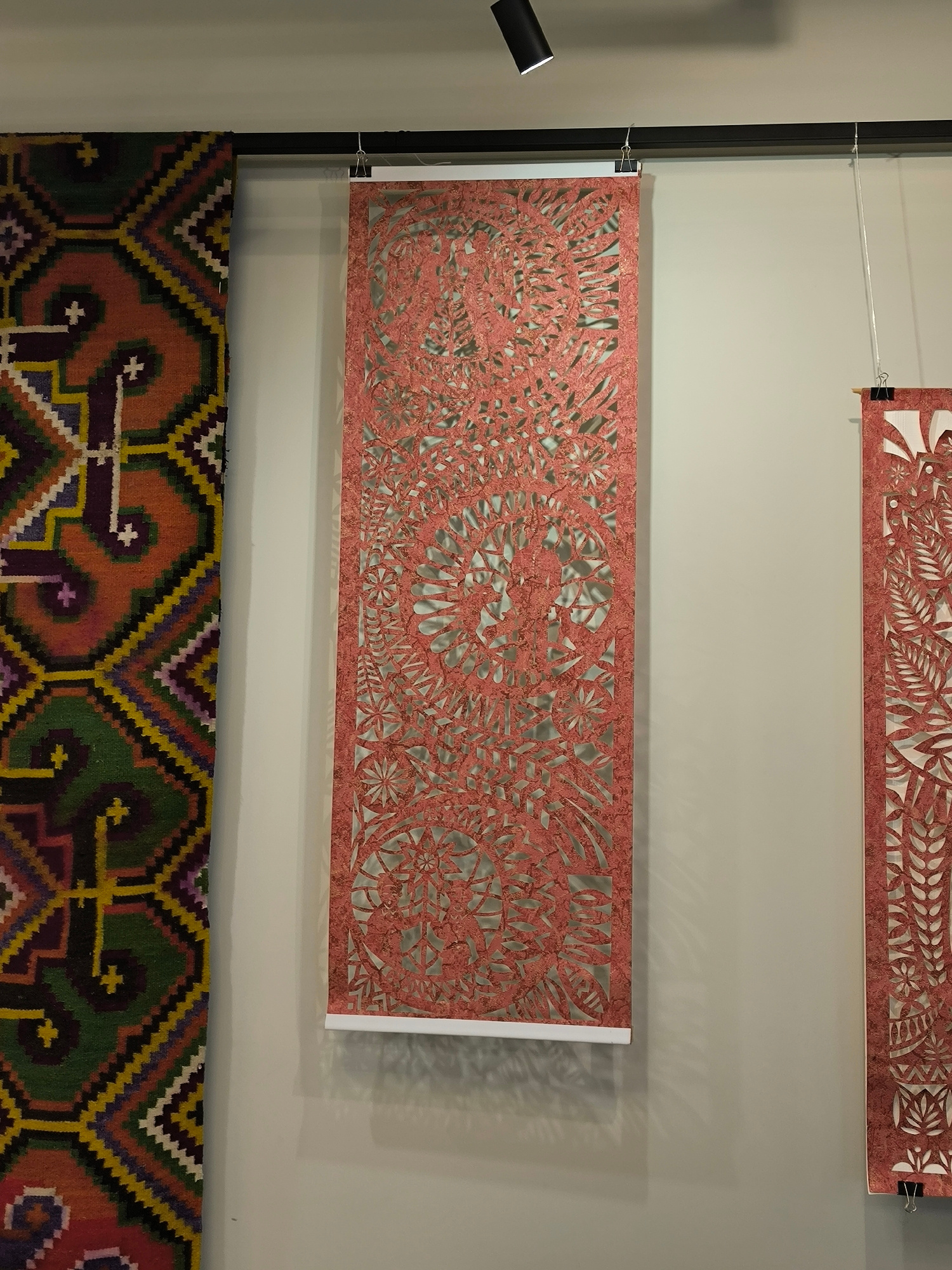 The image shows an indoor scene with a patterned textile hanging on the left and two coral-colored, intricately cut paper artworks hanging vertically on a light grey wall. The patterned textile featur…read more