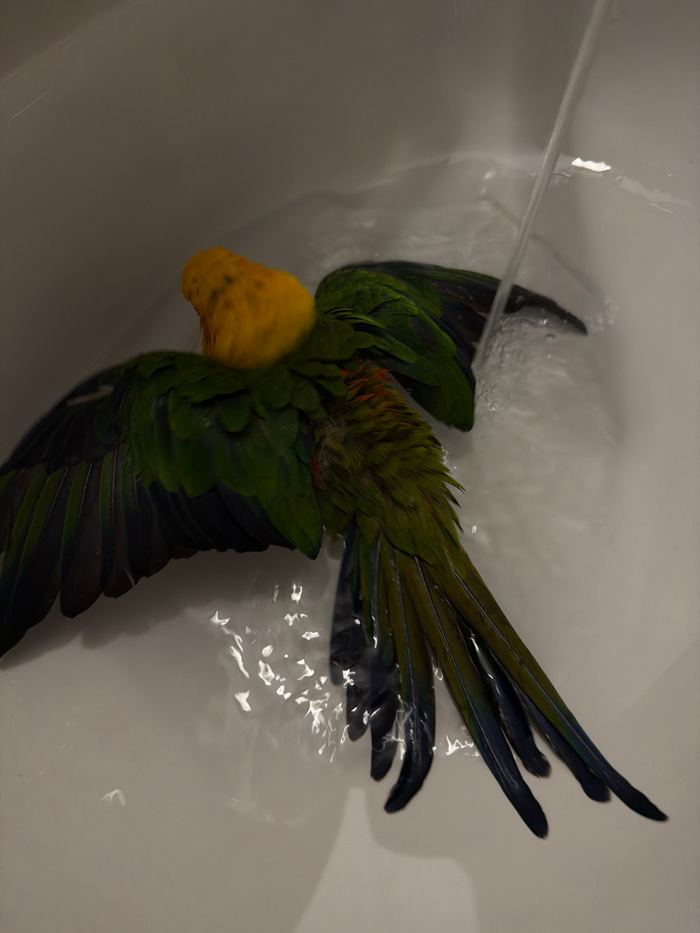 A green and yellow parrot lies in a bathtub under a stream of water. The parrot is on its back with its wings outstretched, showing black and green feathers. Its yellow head is tilted to the side. The…read more