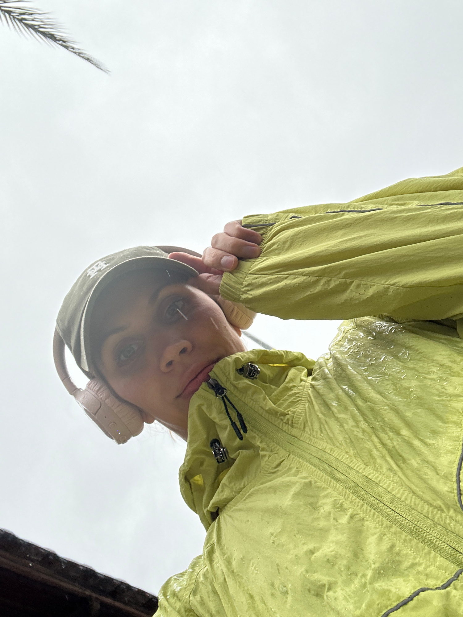 A low-angle photograph taken in Fethiye, Turkey, depicts an individual outdoors under an overcast sky, experiencing precipitation. The subject is wearing a wet, chartreuse-colored hooded jacket with n…read more