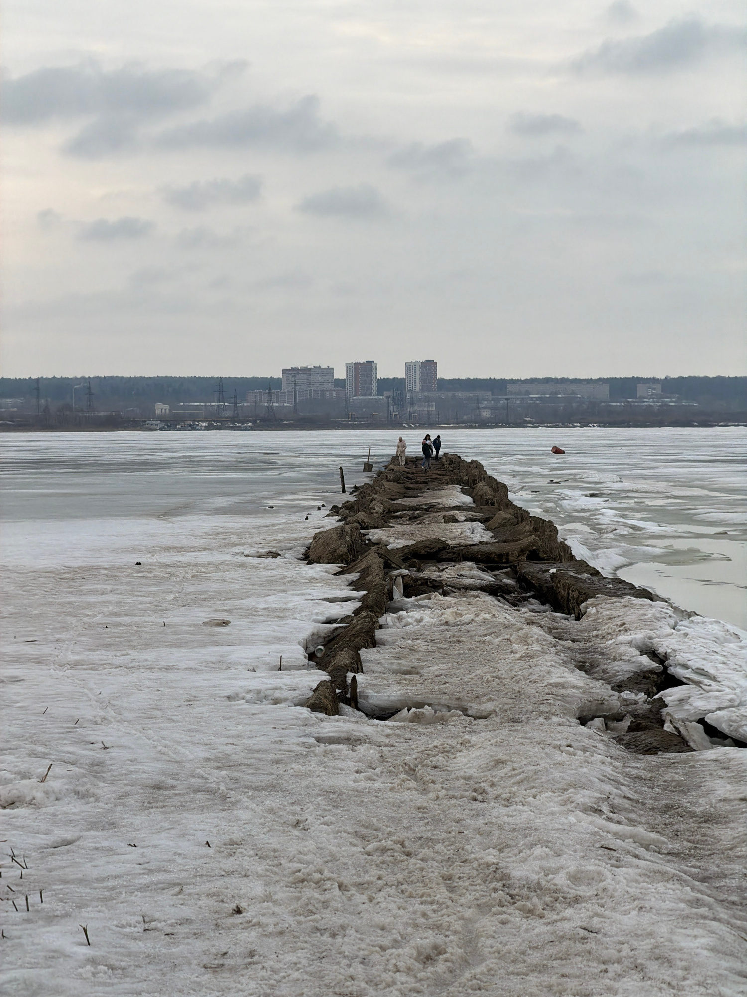 This is an outdoor, slightly high-angle shot of a shoreline in Izhevsk, Russia. The scene appears to be from late winter or early spring, with remnants of snow and ice prevalent. The sky is overcast.…read more