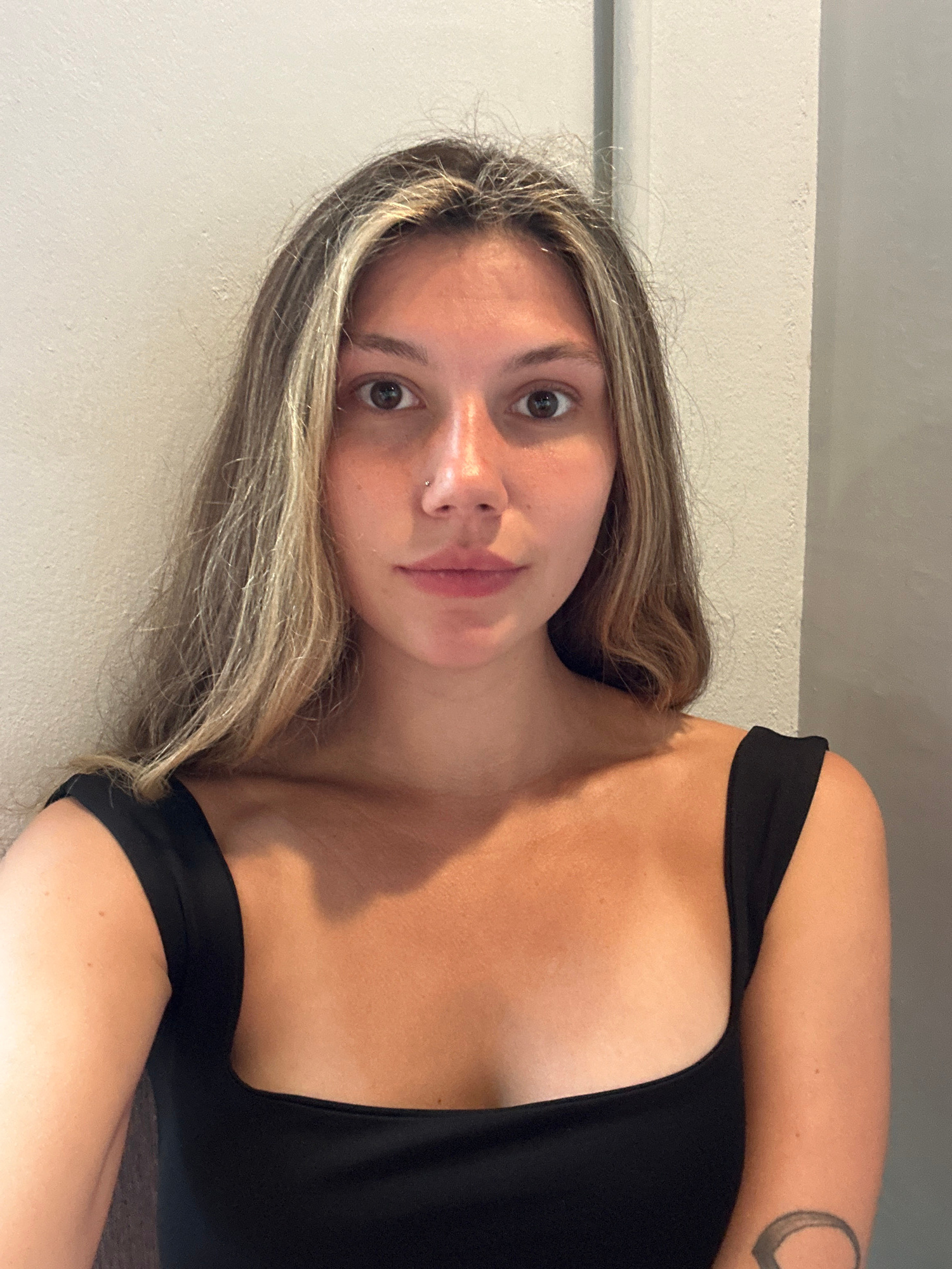 A young woman with fair skin, light brown eyes, and long blonde hair is posing for a selfie. She is wearing a black, off-the-shoulder top. A crescent moon tattoo is visible on her upper left arm. She…read more