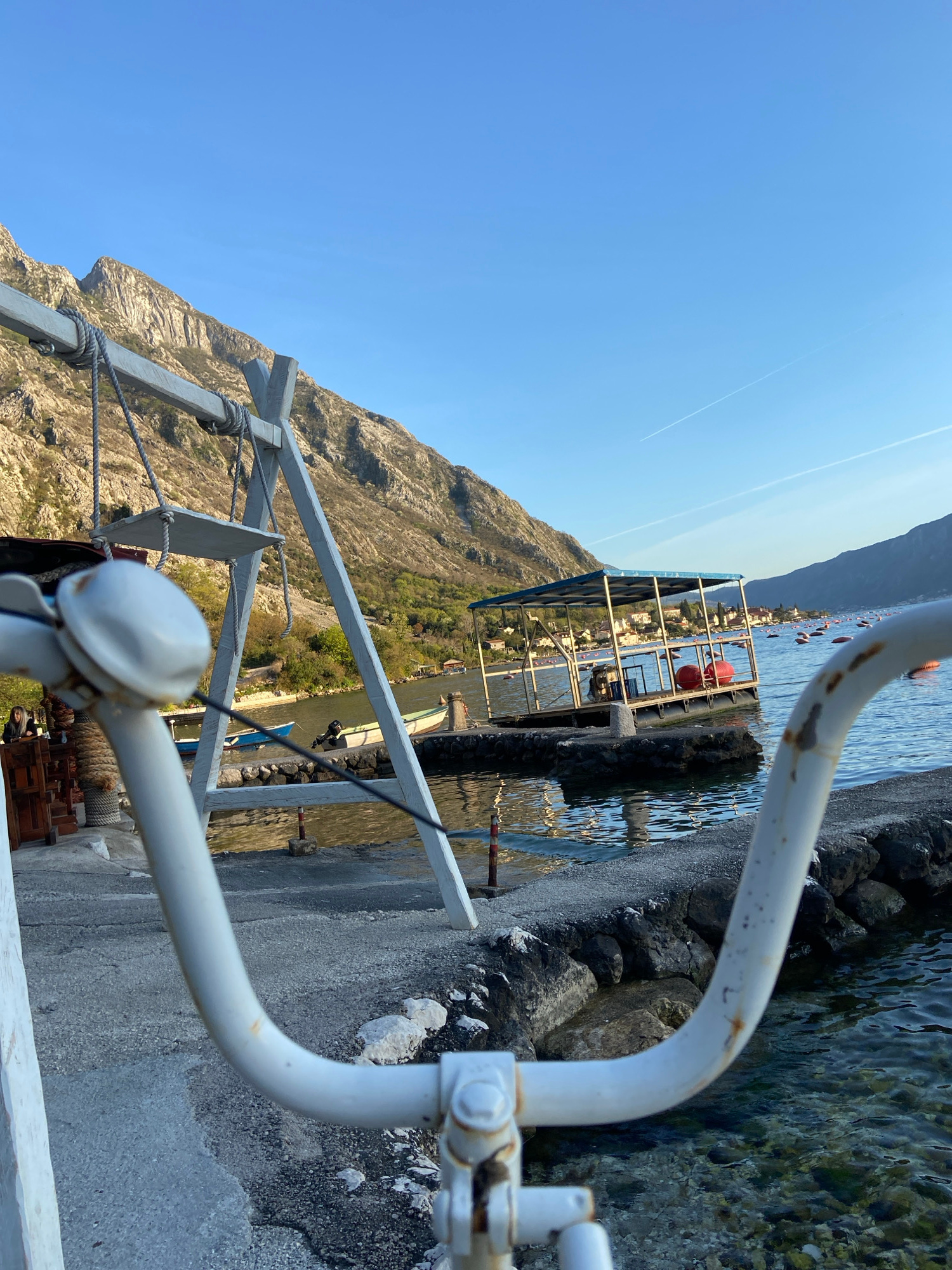 The image shows a view from a dock in Donji Orahovac, Montenegro, looking out towards the Bay of Kotor. In the foreground are sections of white metal railings and structural supports of the dock. The…read more