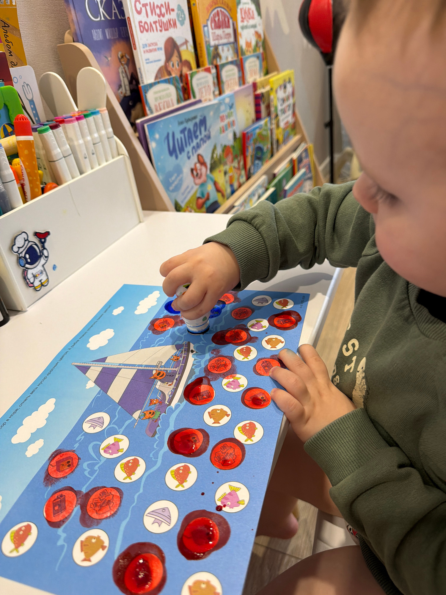A toddler wearing a long-sleeved green shirt stamps red ink onto a blue educational poster depicting a boat sailing on water and surrounded by circles containing fish. The activity appears to be relat…read more