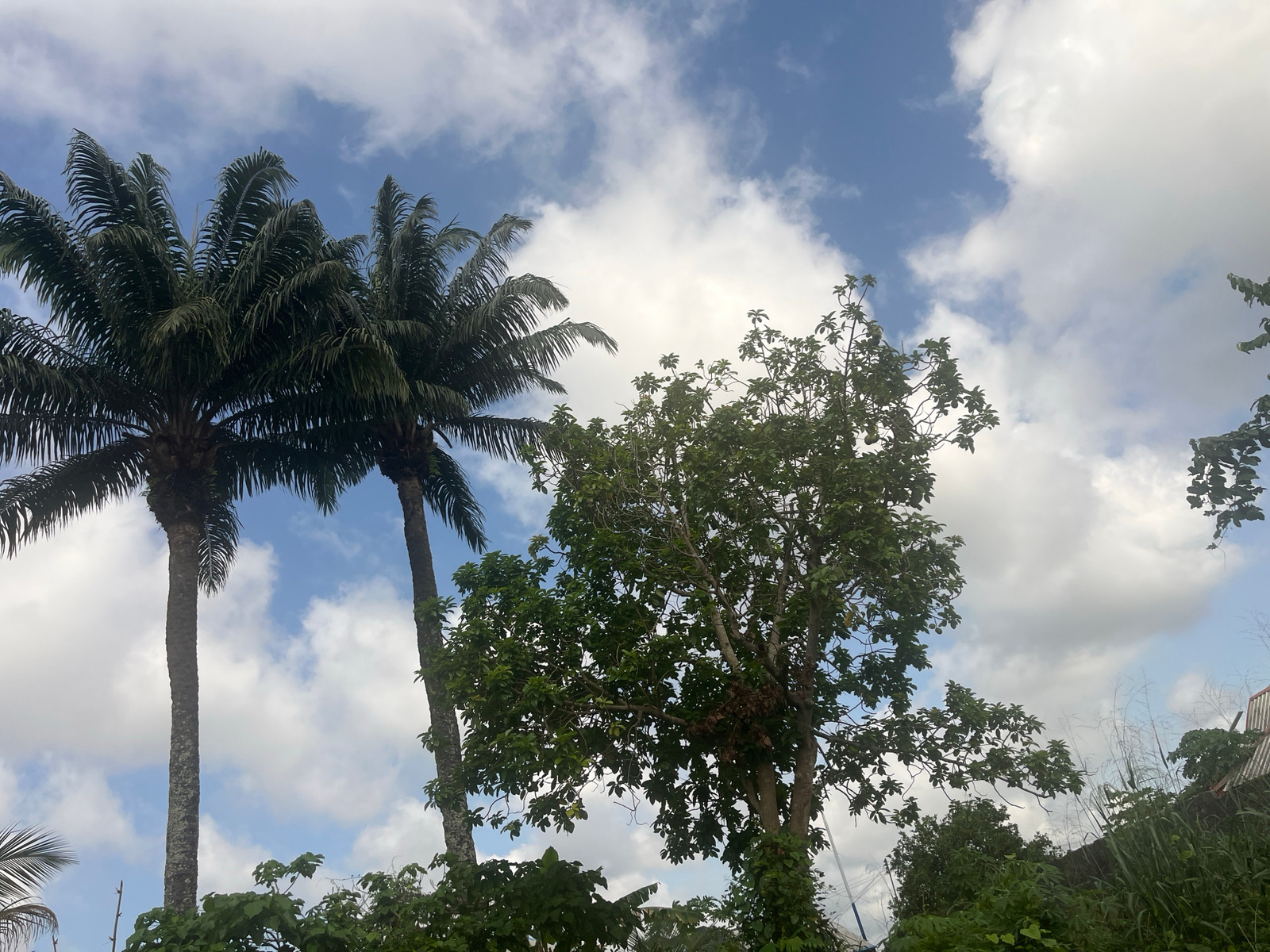 The image shows a view in Ikot Ekpene, Nigeria, featuring two tall palm trees on the left and a leafy tree on the right, all set against a backdrop of a blue sky dotted with white clouds. The vegetati…read more