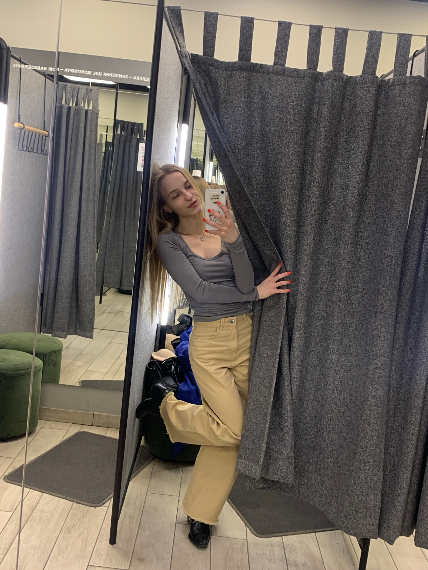 A woman is in a clothing store dressing room. She has blonde hair and is wearing a gray shirt and tan pants. She is lying down and taking a selfie with her phone. The dressing room has gray curtains a…read more