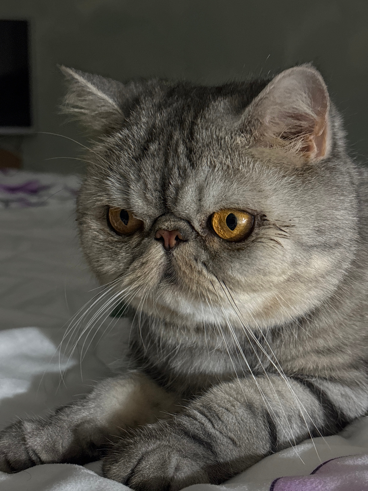 The image shows a close-up of a gray tabby cat with amber eyes. The cat is lying down, with its head tilted downward towards the viewer. The cat's fur is short and dense, with distinct stripes. The background is blurry and appears to be a white and purple fabric. There is no information in the image to suggest it was taken in Chaikovsky, Russia. | Open Wire