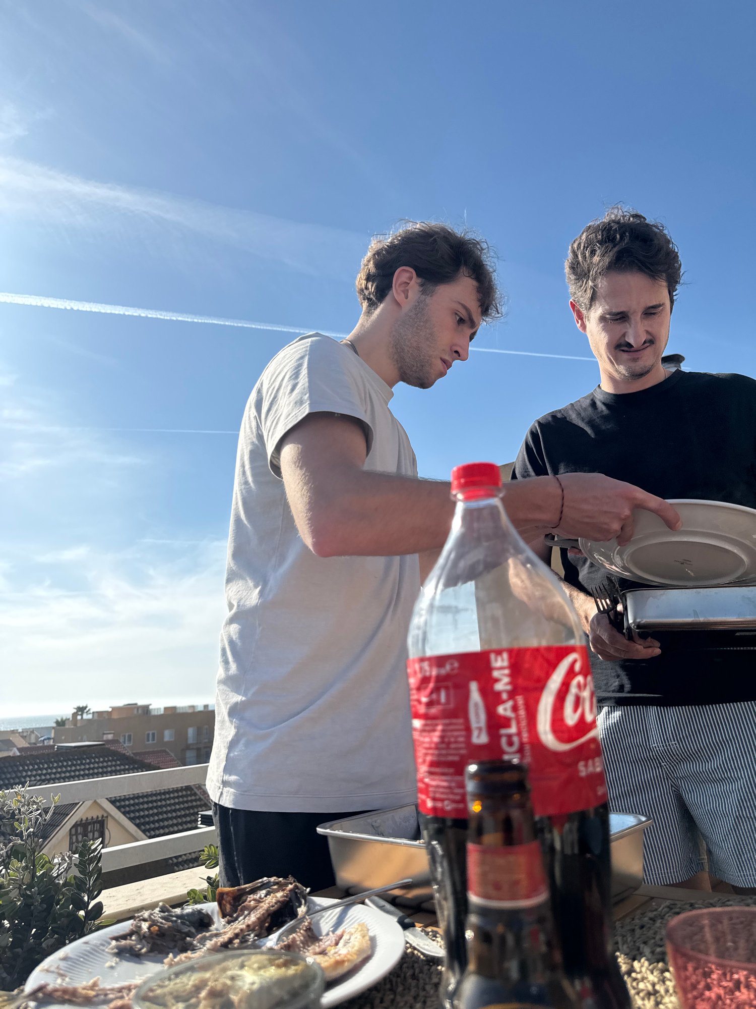 Two men are outdoors on a sunny day, likely on a rooftop or balcony in Vila Nova de Gaia, Portugal. The man in the foreground wears a white t-shirt, and the other man wears a black shirt. There is a n…read more