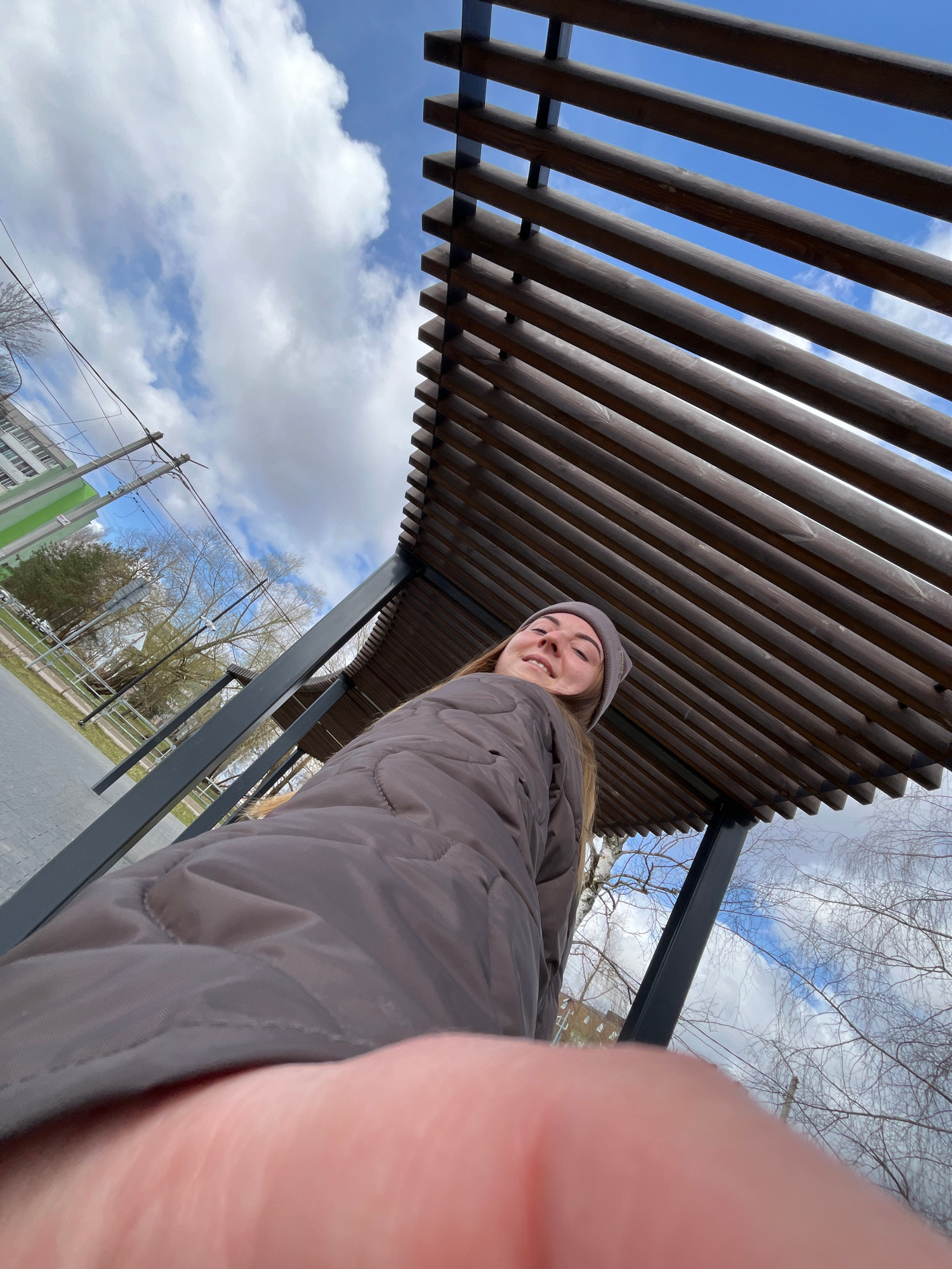 A low-angle shot features a woman in a grey beanie and a grey quilted jacket, smiling towards the camera. A finger partially obscures the right side of the frame. Above her is a pergola made of wooden…read more