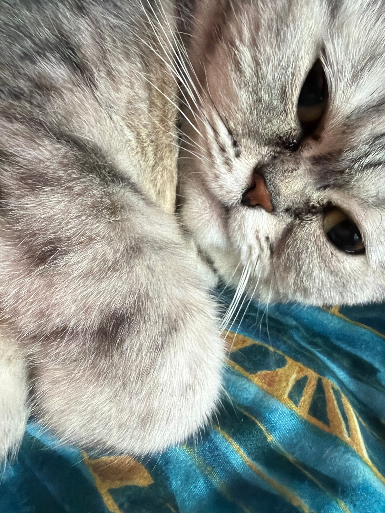 The image depicts a close-up view of a grey tabby cat lying on a blue and gold patterned fabric. The cat's face is prominent, showcasing its eyes, nose, and whiskers. The cat's fur is detailed, showinβ¦read more