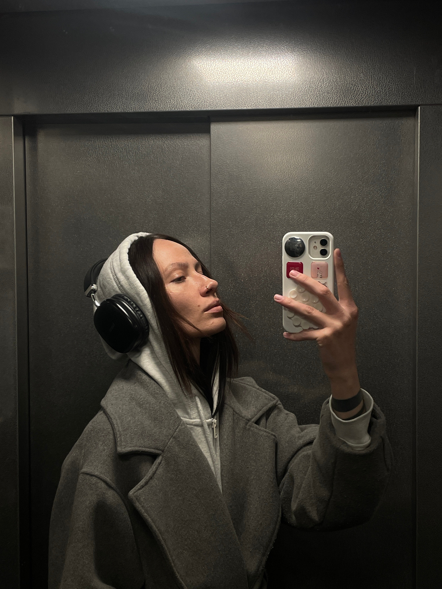 A female subject is taking a selfie in what appears to be an elevator. She is wearing a grey hoodie, a grey coat, and headphones around her neck. The phone she is holding has a white case with multi-c…read more