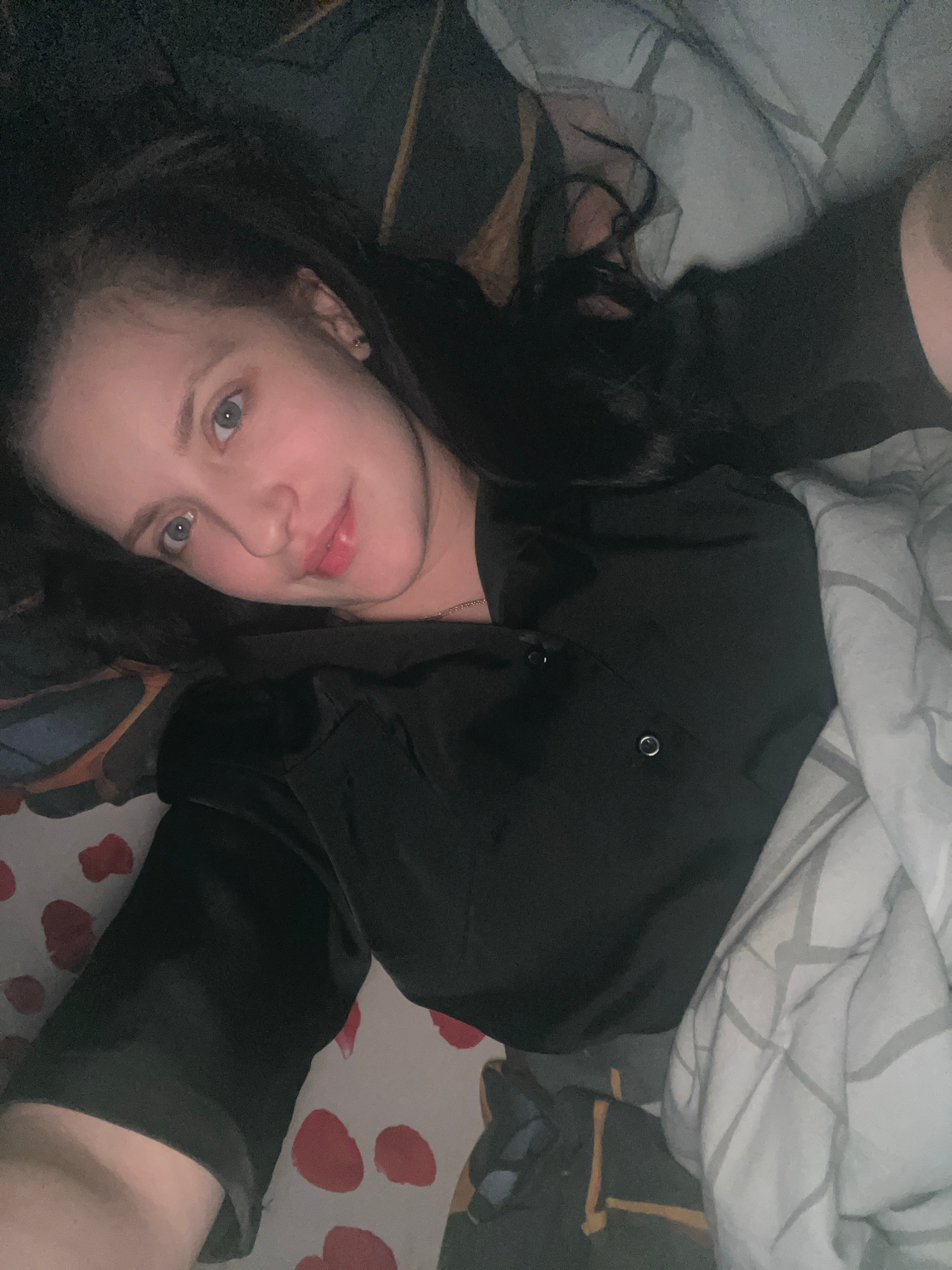 A woman with dark hair and light eyes is lying on a bed. She is wearing a black shirt. The bed has patterned sheets and a grey and white blanket. The location is not discernible as Марковский, Russia…read more