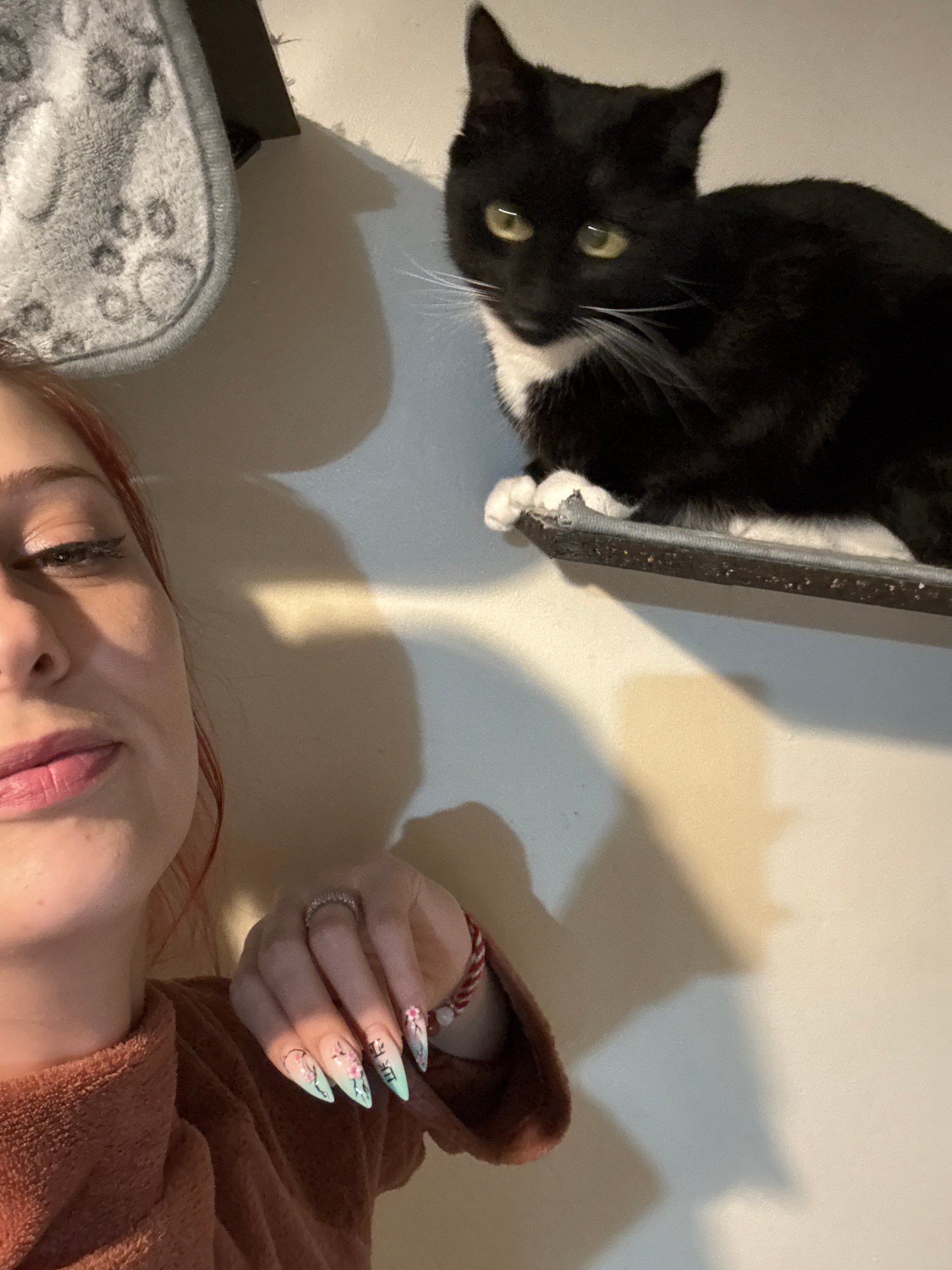 The image depicts a person lying down with a black and white cat positioned at the top of the frame. The cat has yellow eyes and white whiskers, and appears to be lying on a ledge or surface. The pers…read more