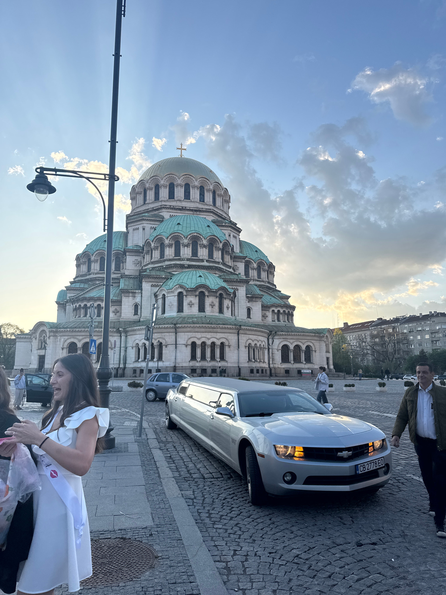 The image shows the Alexander Nevsky Cathedral in Sofia, Bulgaria, a prominent Orthodox cathedral known for its golden domes. In the foreground, a woman wearing a white dress and a "bride-to-be" sash…read more