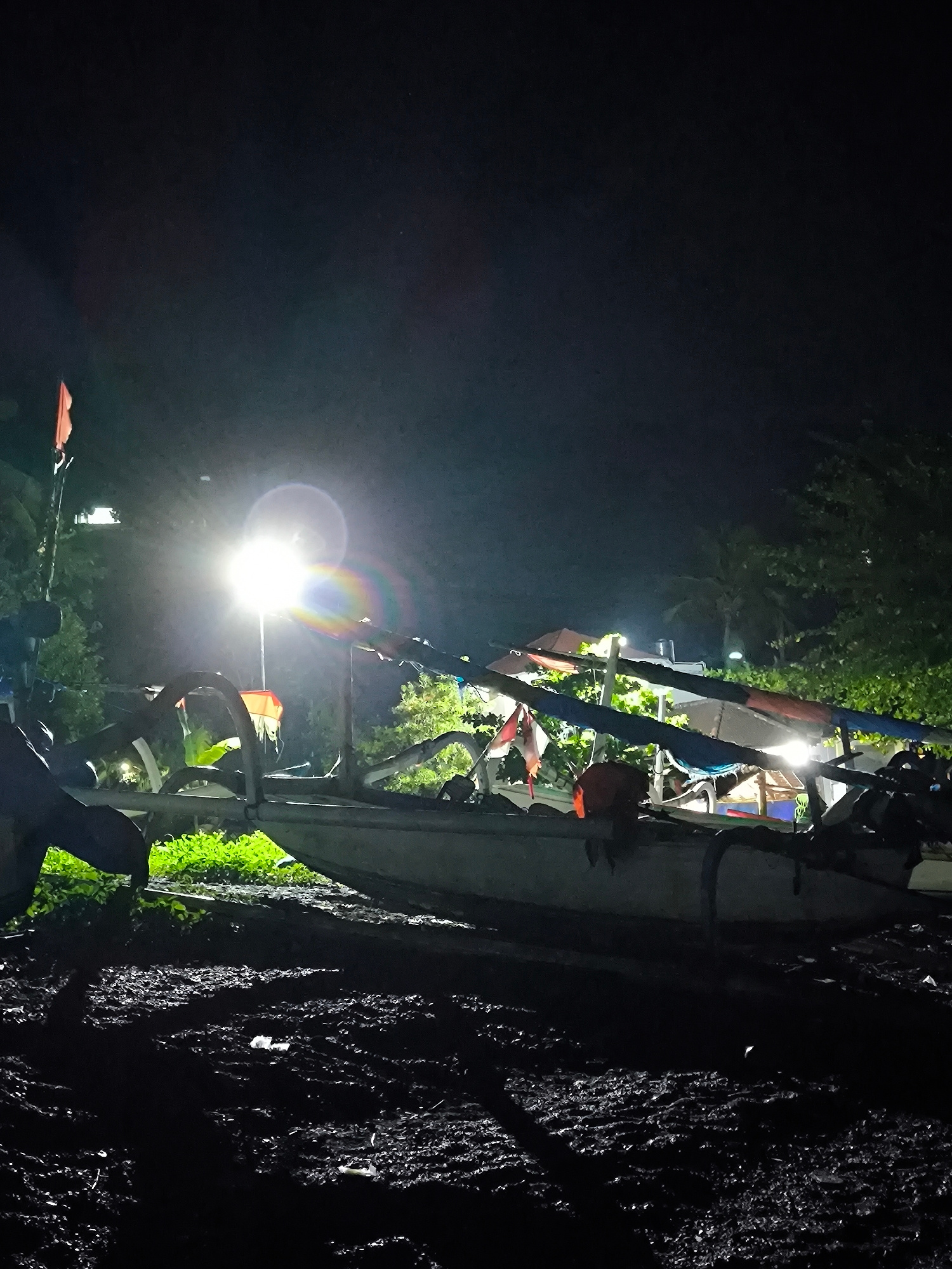 At night in Abang, Indonesia, a light illuminates a traditional outrigger boat on dark, likely muddy ground. The boat, possibly a Jukung, has multiple outriggers, colorful fabric coverings, and flags.…read more