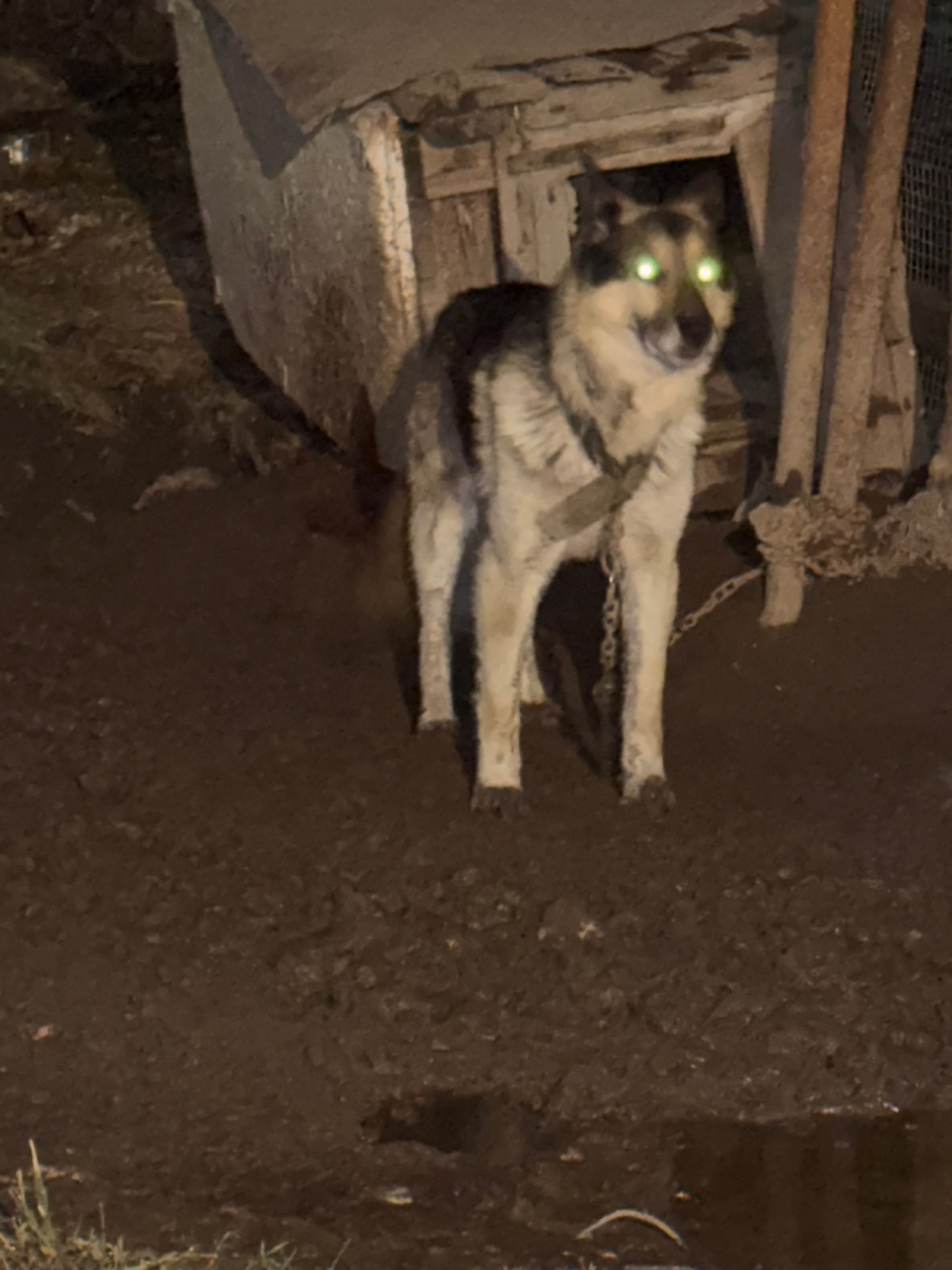 A canine with glowing, potentially reflective eyes is chained outside of a dilapidated dog house. The setting is dark, possibly nighttime, and the surrounding area appears to be dirt or mud. The locatβ¦read more