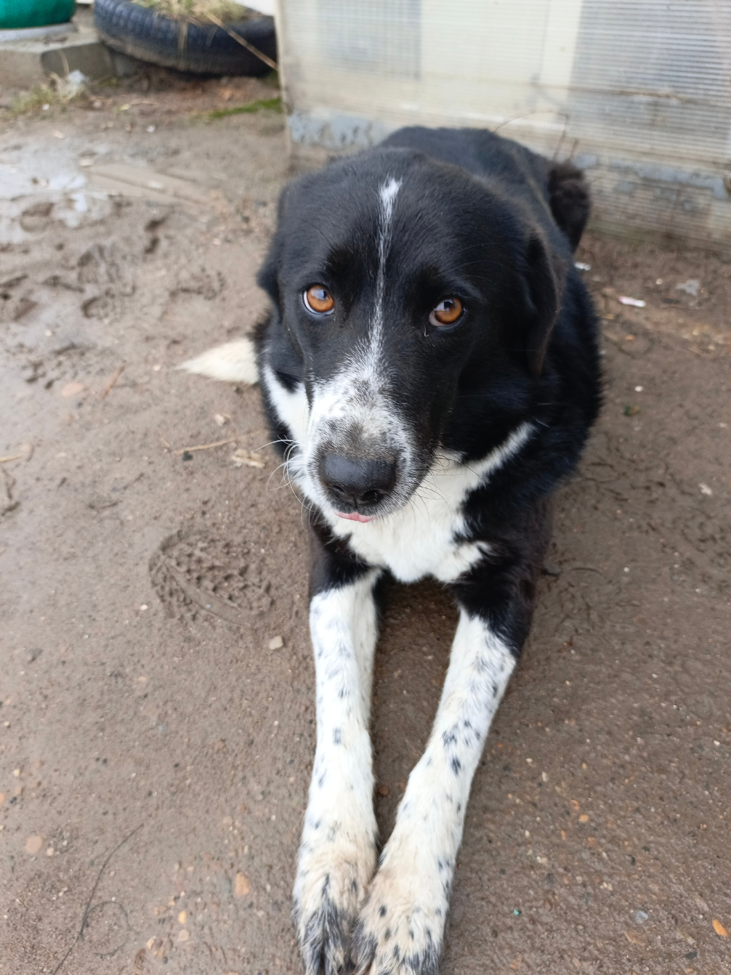A medium shot captures a dog lying down in what appears to be an outdoor, possibly semi-rural setting. The dog has black fur with white markings on its chest, legs, and face. It has brown eyes and a s…read more