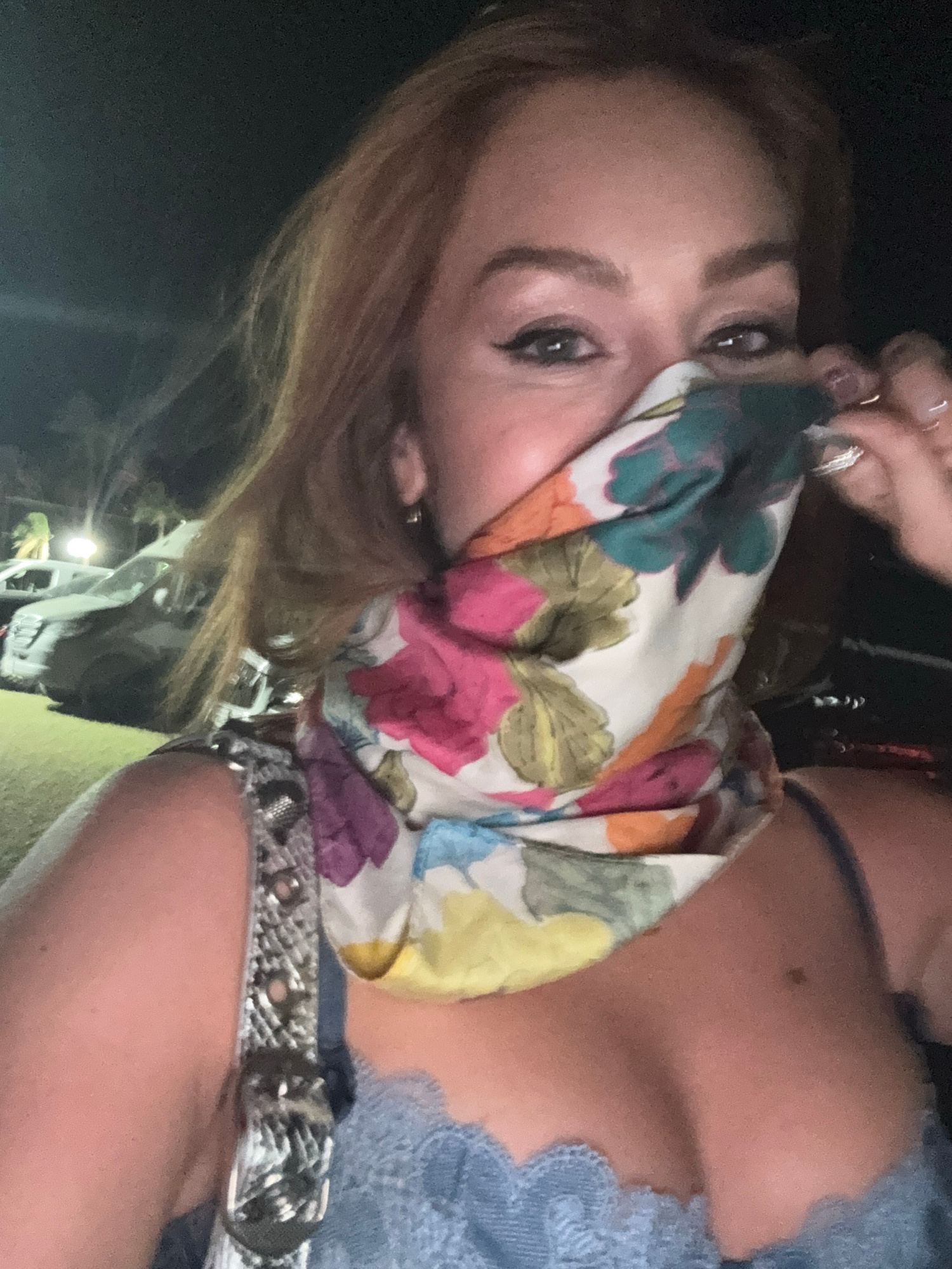 A woman is partially covering her face with a floral scarf. The scarf is predominantly white with roses of various colors including pink, orange, and purple. Her eyes are visible and appear to be look…read more