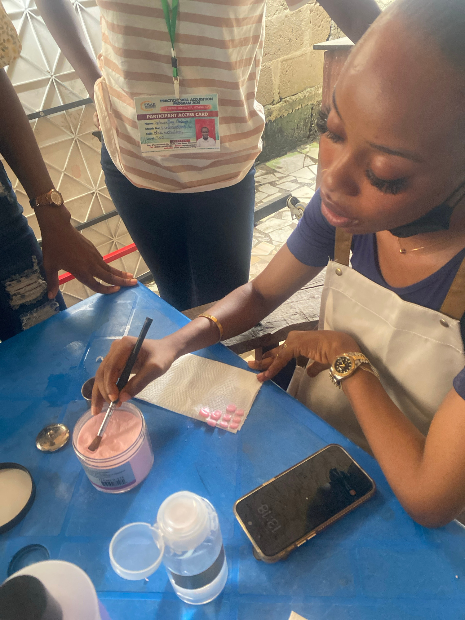 An indoor scene, likely a workshop or training session in Badagry, Nigeria, shows two individuals engaged in an activity around a blue table. In the foreground, a woman wearing a blue top, a white apr…read more