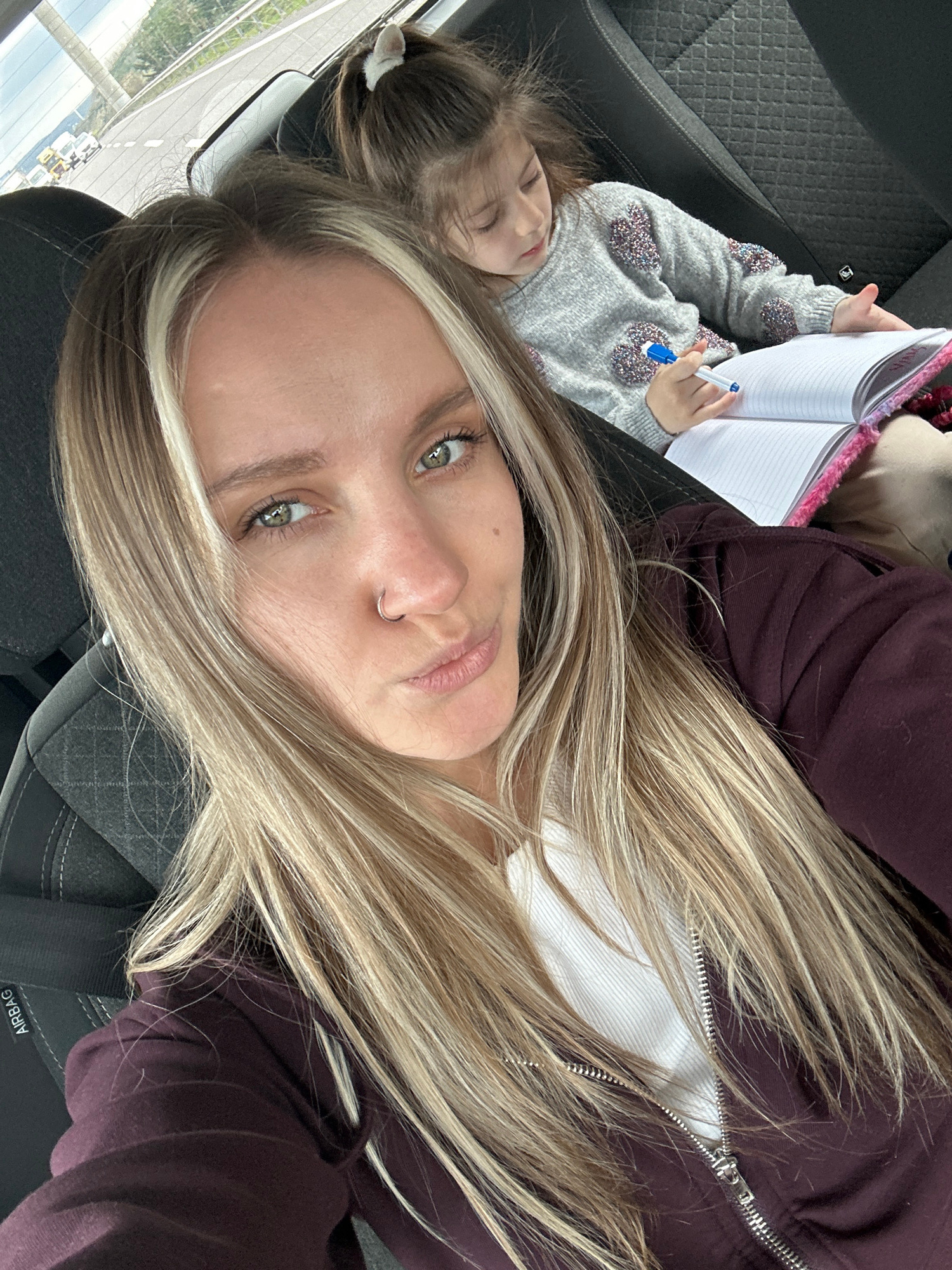 A woman and a young girl are in a car, with the girl lying on the back seat. The woman, positioned closer to the camera, has long blonde hair, light skin, green eyes, and a nose ring. She wears a dark…read more