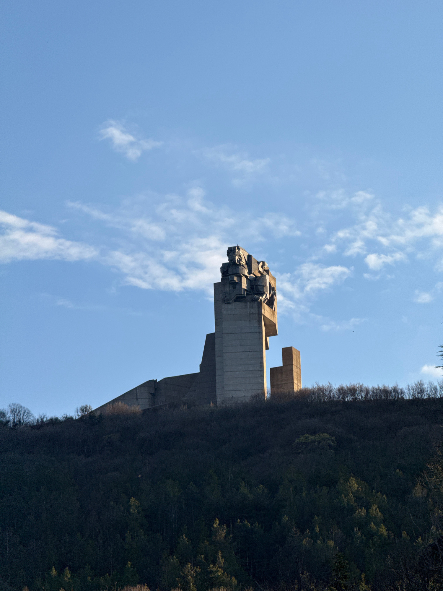 The image shows the Founders of the Bulgarian State Monument in Shumen, Bulgaria. The monument is a large concrete structure with stylized figures at the top, positioned on a hillside. The sky is blue…read more