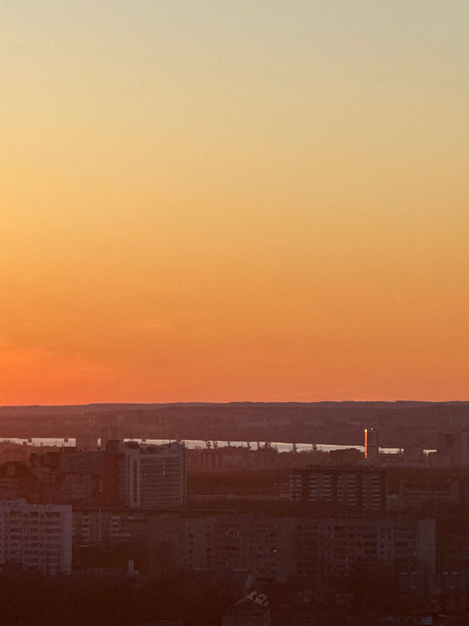 The image depicts a cityscape at sunset. The sky transitions from yellow to orange. On the right side of the image are city buildings, a river, and a road. The image is a view of the city of Perm, Rus…read more