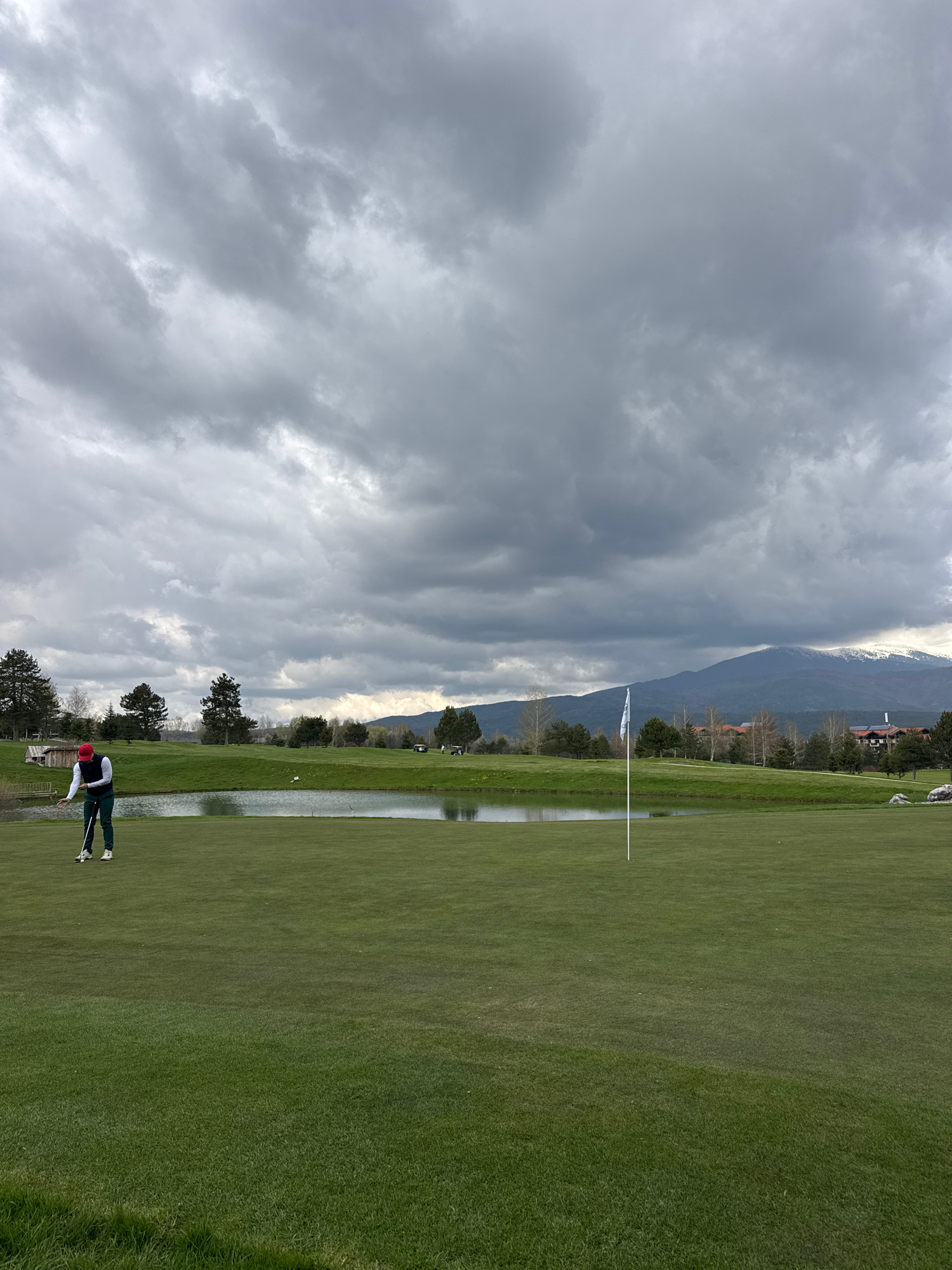 A vertical wide shot captures a golfer on a green, likely at the Pirin Golf and Country Club in Razlog, Bulgaria, given the mountainous backdrop. The scene unfolds on a cloudy day, with the sky domina…read more