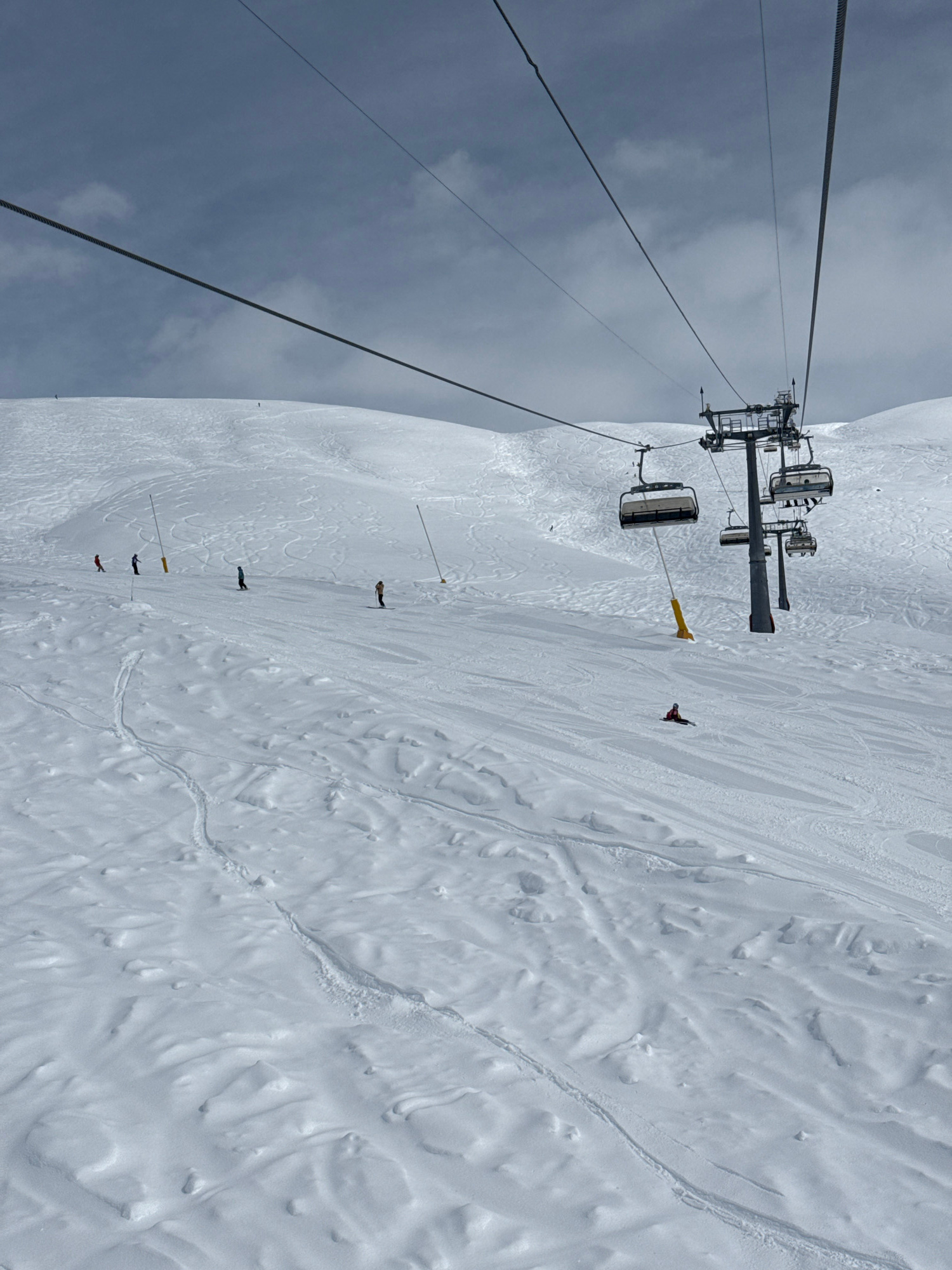 The image shows a ski slope in Gudauri, Georgia, viewed from a ski lift. The sky is overcast. Skiers are visible on the snow-covered slope, marked by flags. The ski lift infrastructure, including cabl…read more