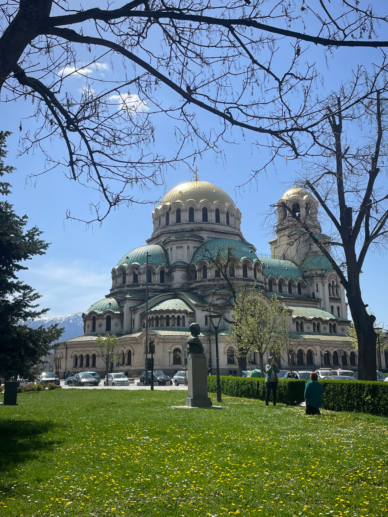 The image captures a sunny, outdoor scene in Sofia, Bulgaria, featuring the prominent Saint Alexander Nevsky Cathedral. The time of day is bright daylight, with a clear blue sky marked by a few wispy…read more