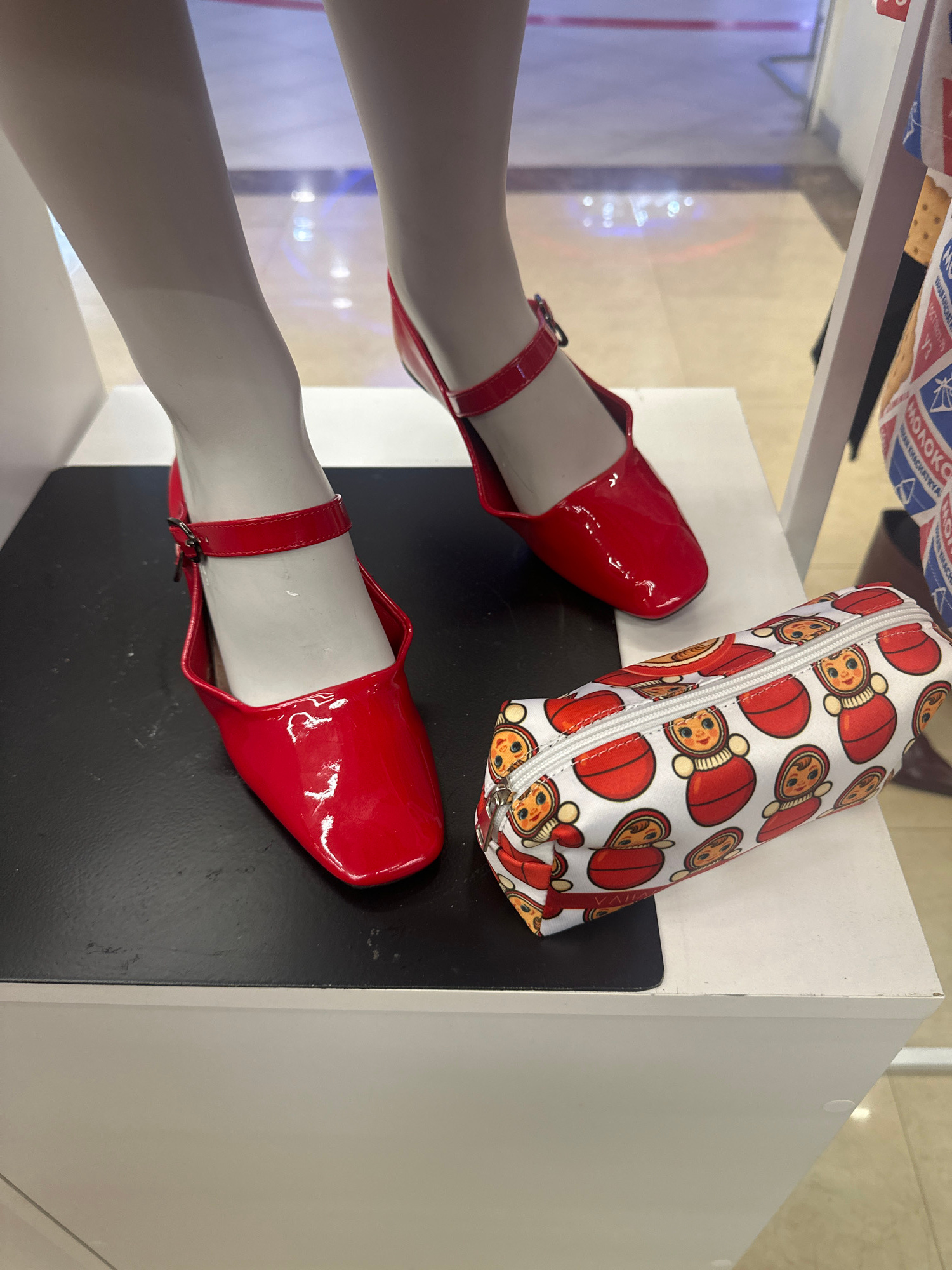 The image shows a display with two red, patent leather Mary Jane shoes on what appears to be mannequin legs. The shoes are styled with a strap across the instep. A cylindrical pencil case adorned with…read more