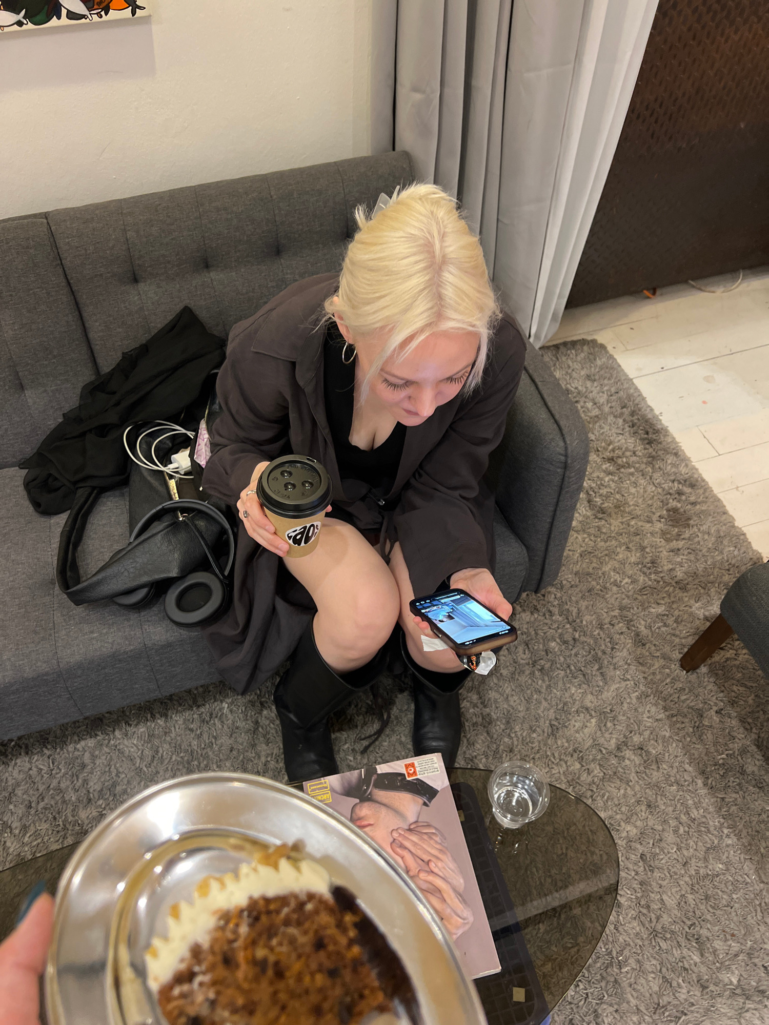A high-angle shot shows a person with blonde hair sitting on a gray couch. They are wearing a black top, a gray jacket, and black boots. The person is holding a mobile phone in their right hand and a…read more
