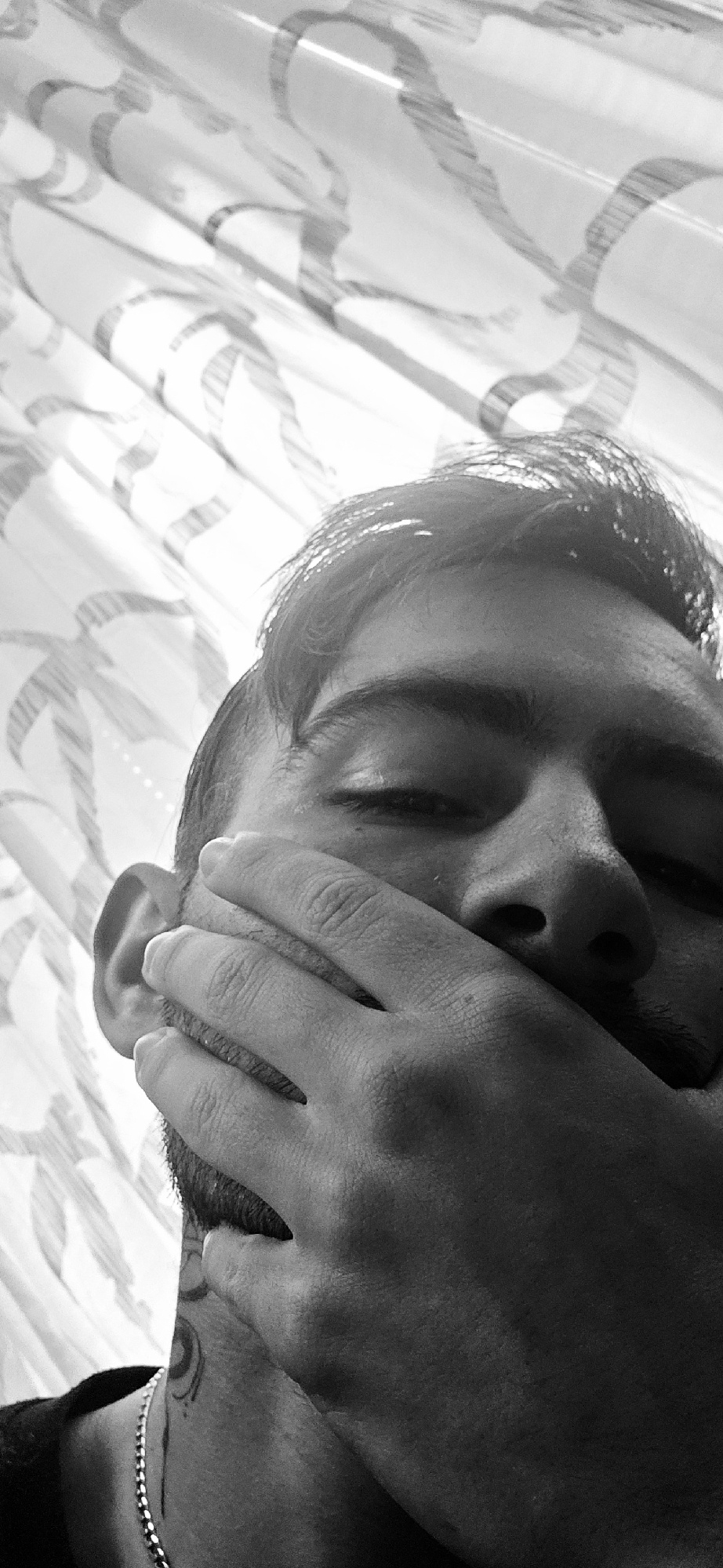 This black and white photograph, taken in Kostenets, Bulgaria, presents a close-up, low-angle view of a person resting indoors. The subject, likely male with short hair and visible facial stubble, is…read more