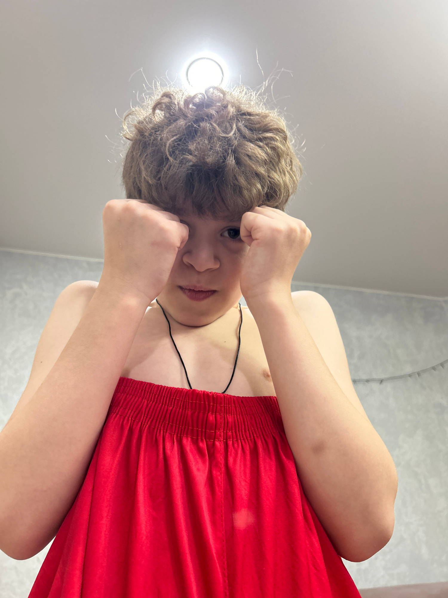 A young person with curly light brown hair and fair skin stands in front of a light gray and white wall. They are wearing red shorts and a thin black necklace. They are holding their fists up in front…read more