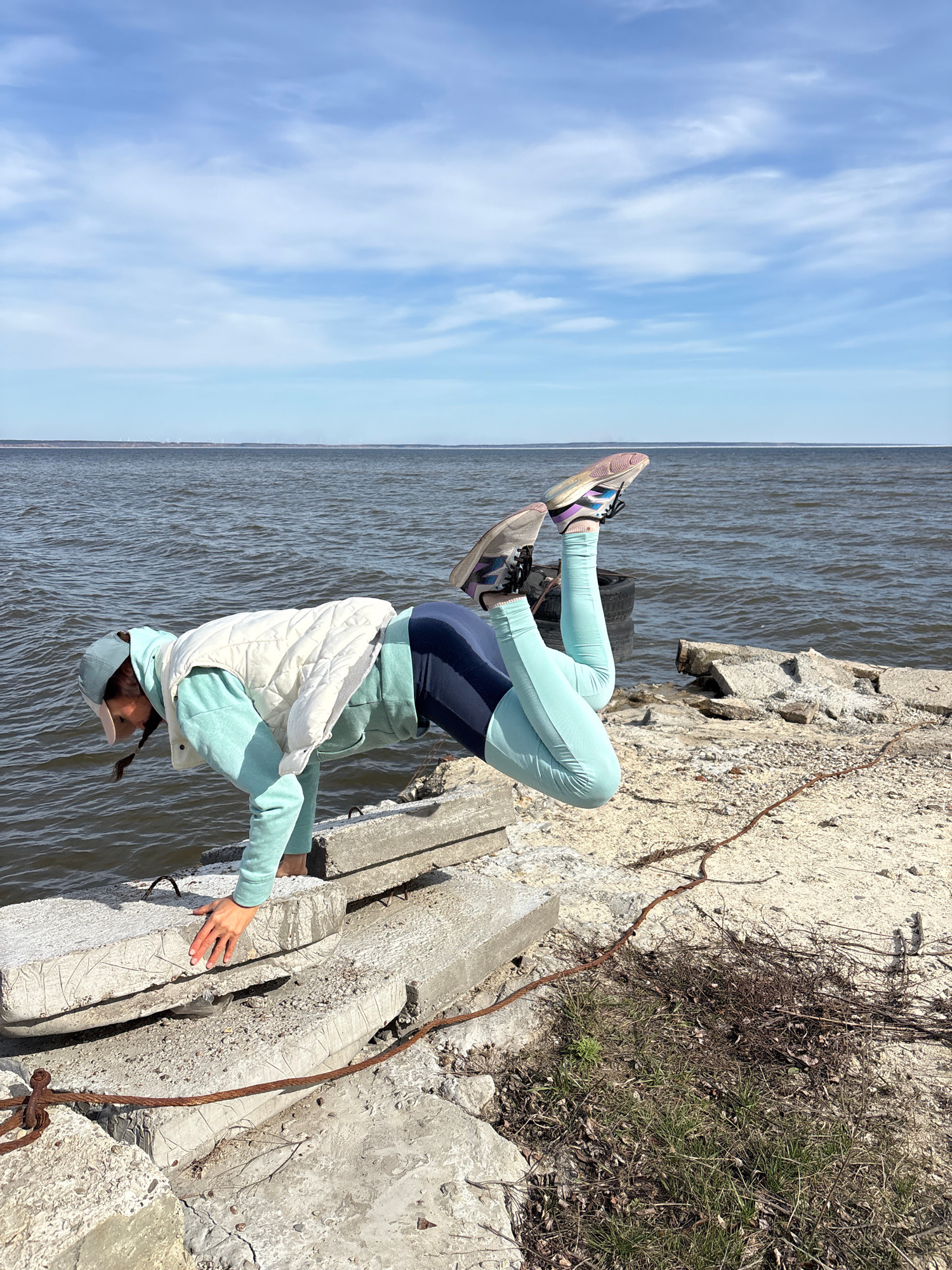 The image captures an individual performing an inverted physical pose, resembling a headstand or handstand, on concrete structures next to a large body of water. The person is positioned with their ha…read more
