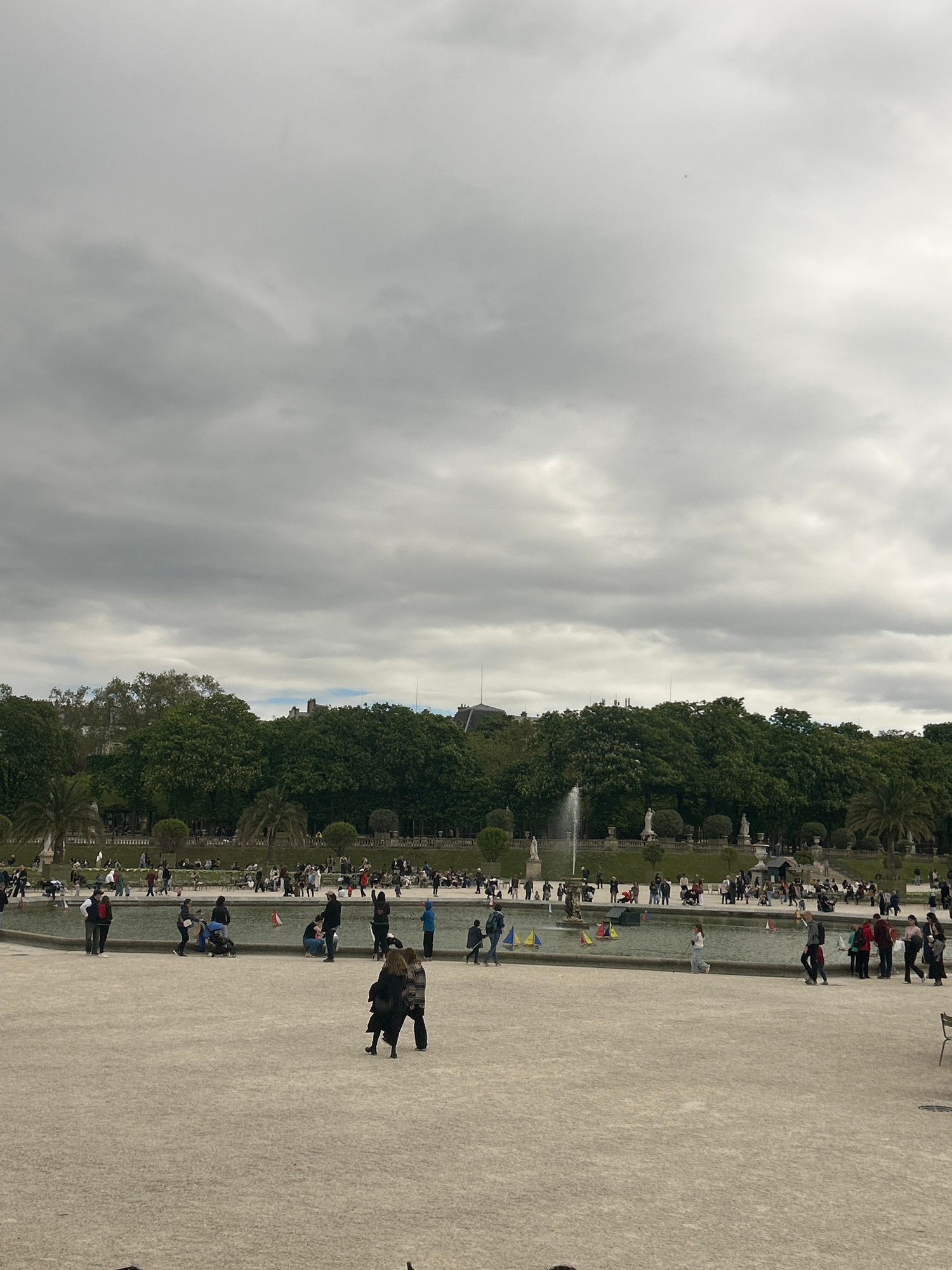 The image depicts the Jardin des Tuileries in Paris, France, on a cloudy day. The garden features a long, rectangular pool with a fountain in the distance, lined with trees, statues, and manicured hed…read more