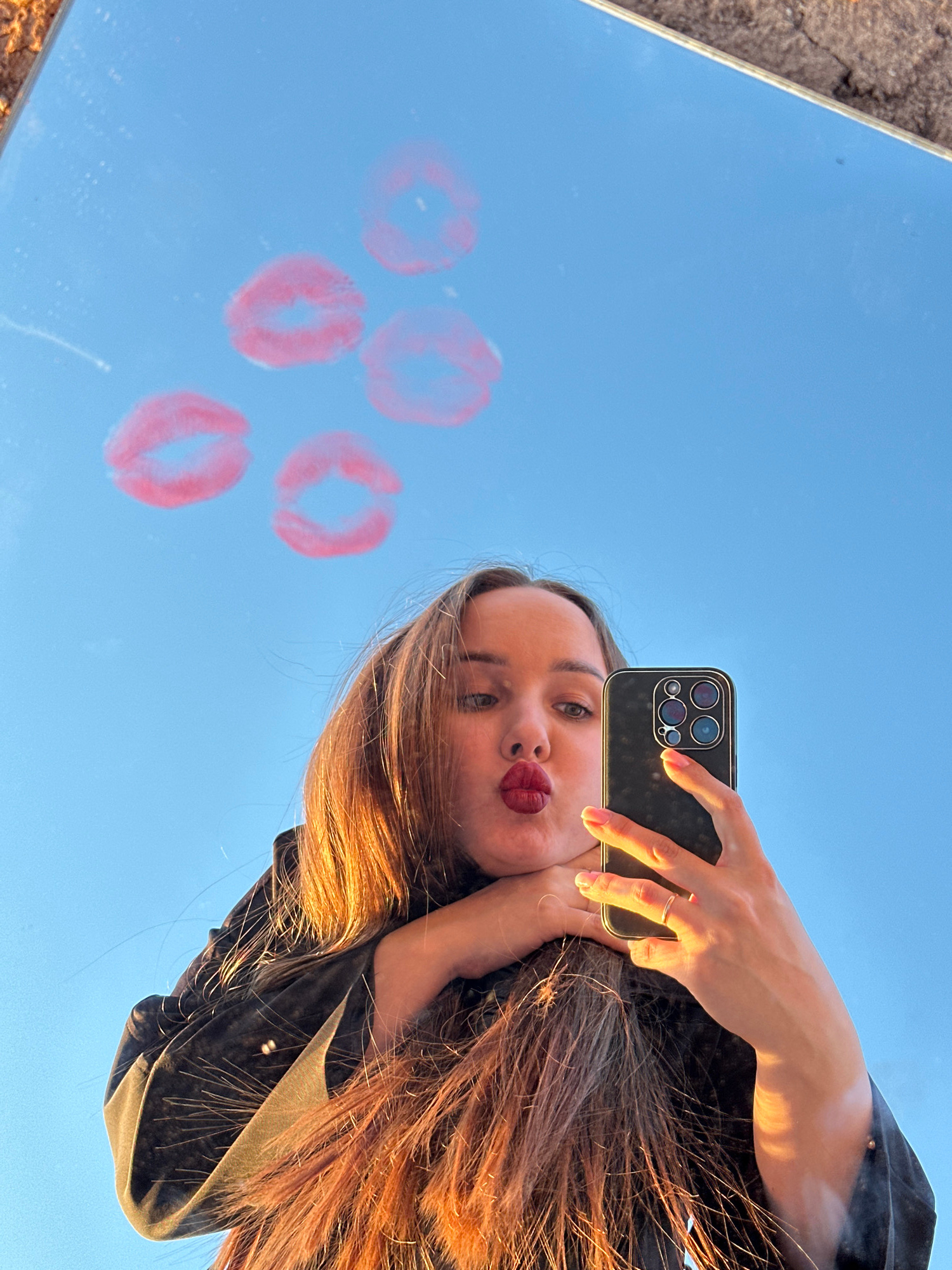 The image shows a young woman taking a selfie reflected in a mirror. She is holding a smartphone with four camera lenses visible. The mirror shows a clear blue sky and six red lipstick kiss marks on i…read more
