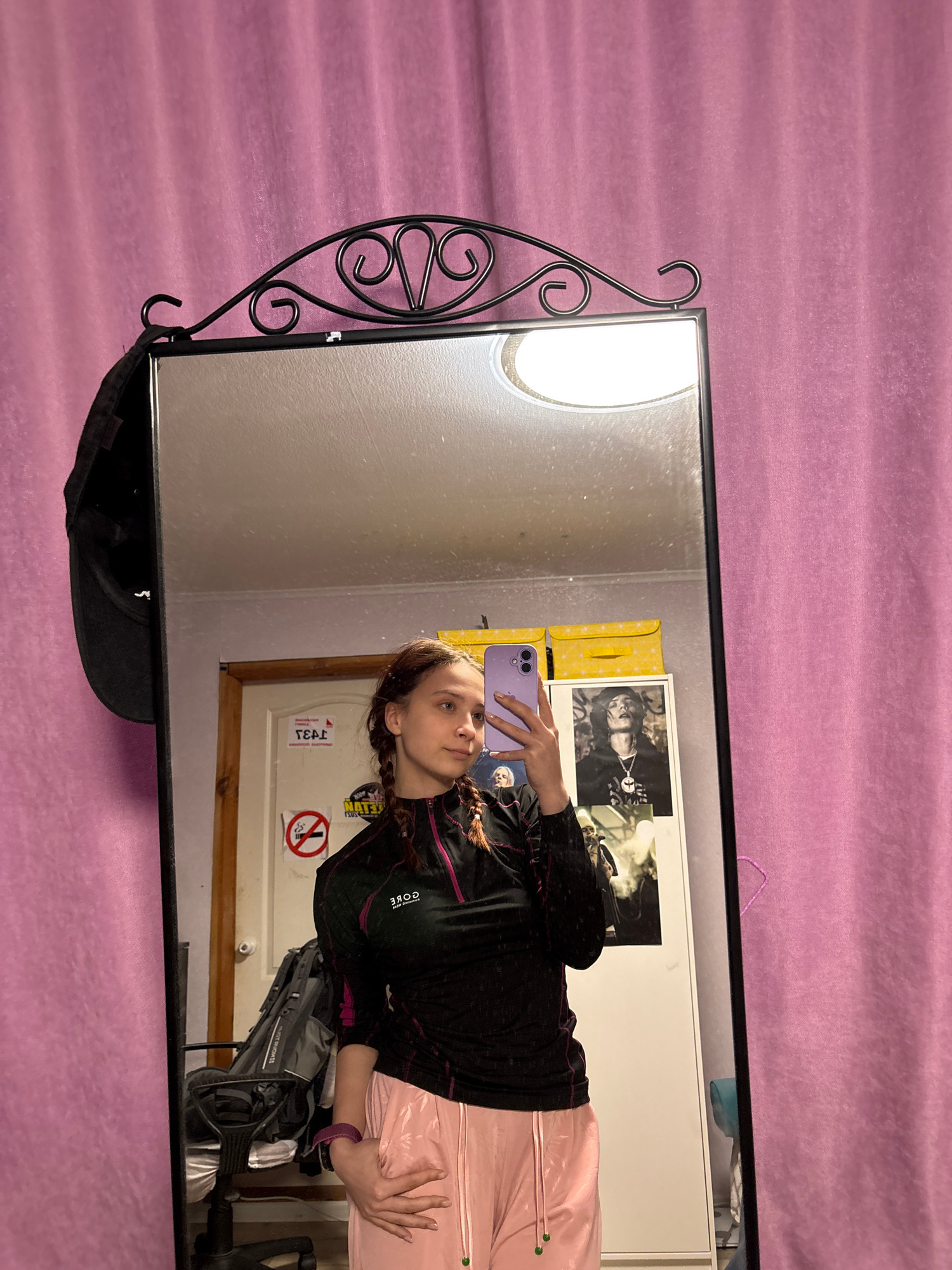 A selfie of a person with long braided hair, wearing a black athletic jacket and light pink pants. They are holding a purple phone in their left hand, taking a picture in a mirror with a decorative bl…read more