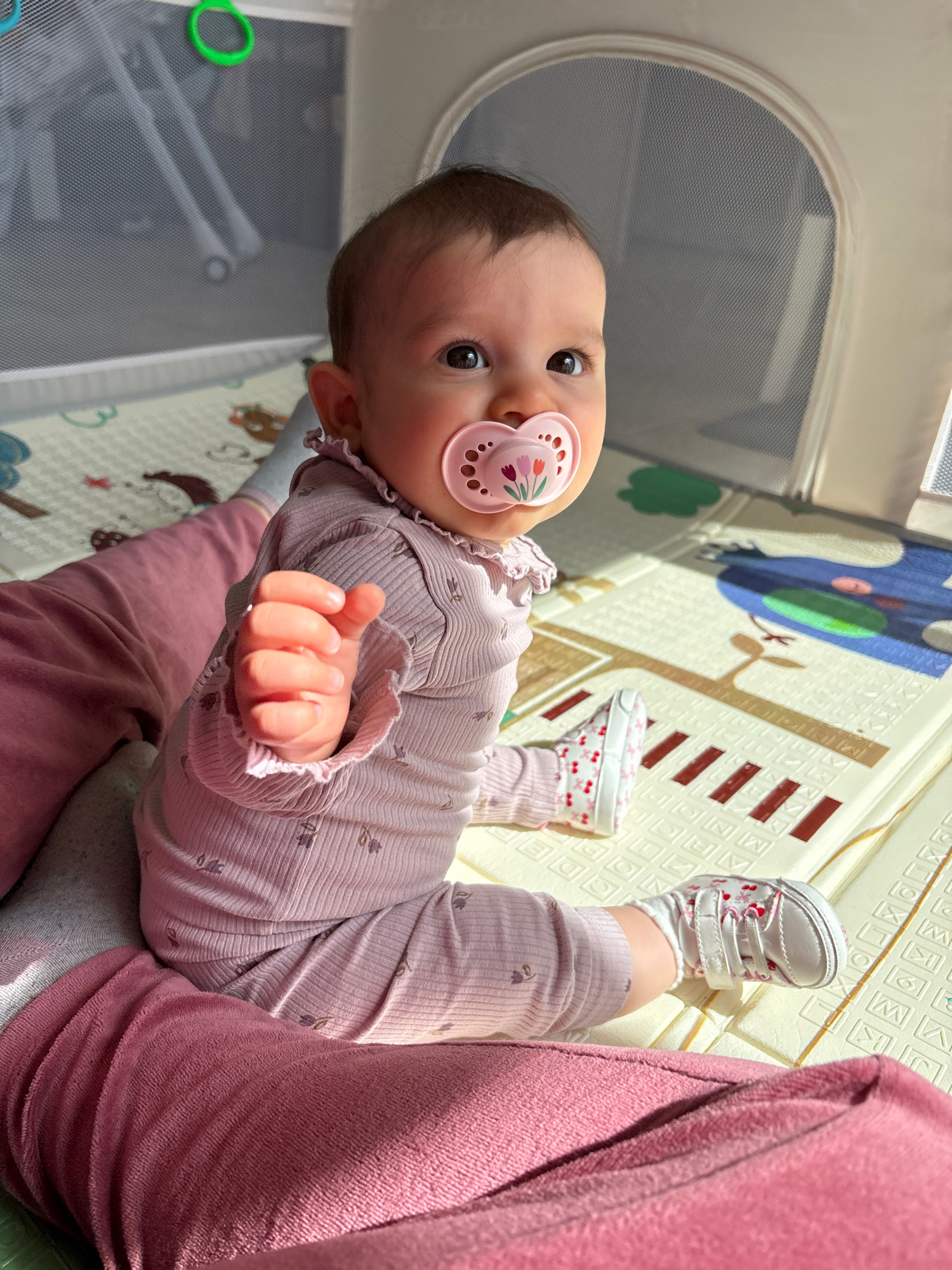 A baby with a pink pacifier is lying on a person's lap. The baby is wearing a pink outfit with a floral pattern and white shoes with cherry designs. The person is wearing pink pants and gray socks. Th…read more