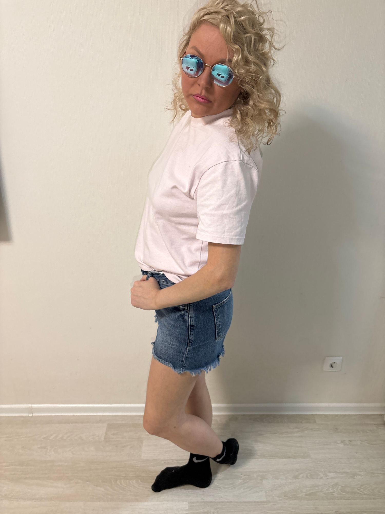 A woman is posing in a room with light walls and a wooden floor. She is wearing a light pink t-shirt, blue denim shorts, blue sunglasses, and black socks. The location is presumably indoors. There is…read more