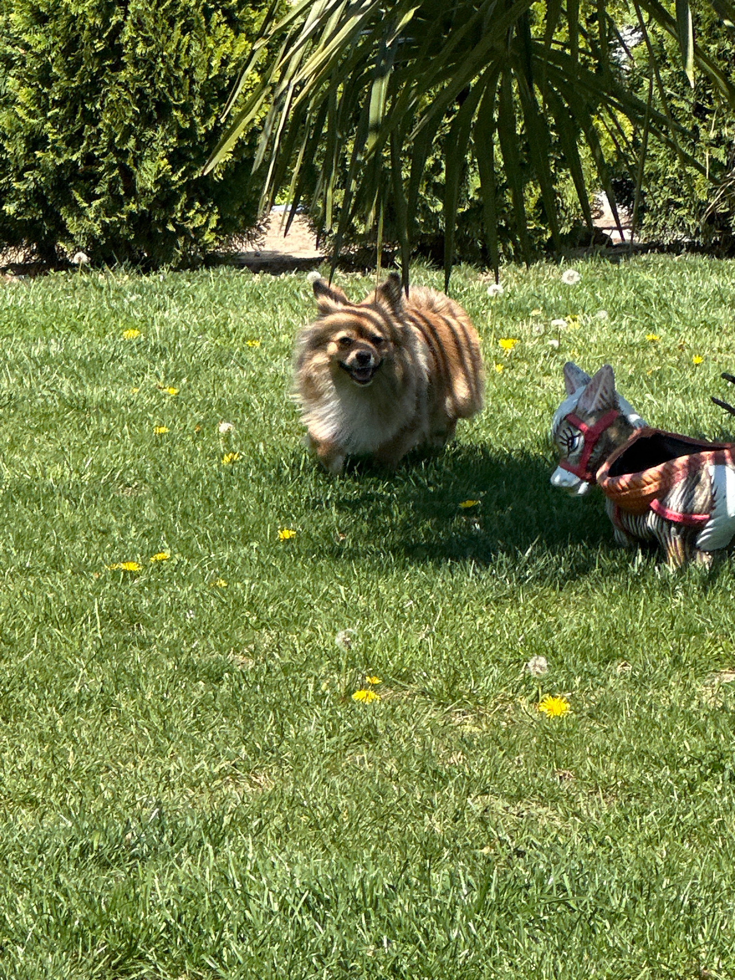 A yard contains a potted evergreen tree on the left and grass with dandelions on the right. In the middle of the frame there is a furry brown animal, possibly a rabbit. An object shaped like a cat wit…read more