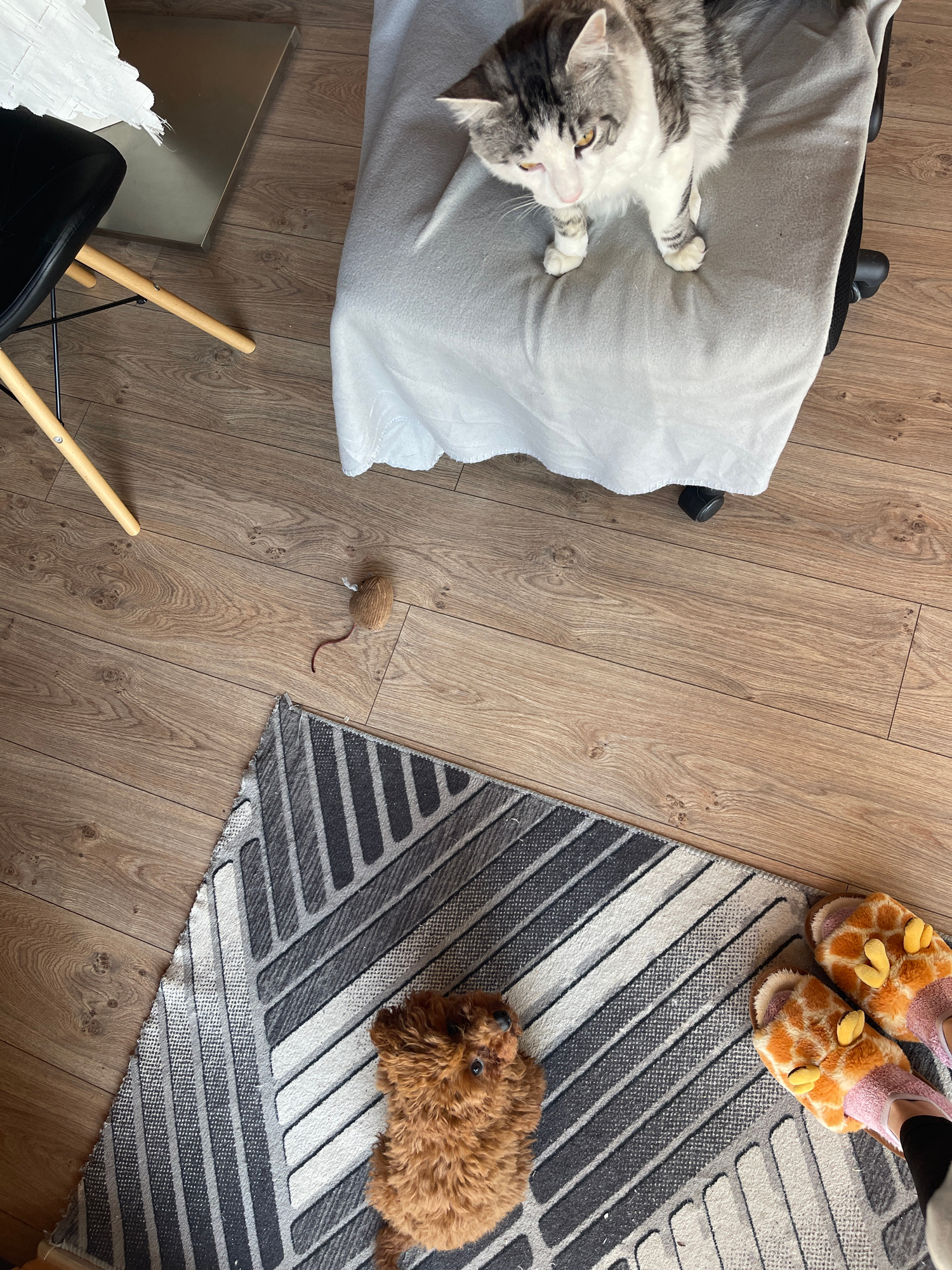 An overhead view captures a cozy indoor scene in Sofia, Bulgaria, featuring a cat, a person's feet, and a plush toy. The floor is covered with light brown wooden planks, with a section of a geometric…read more