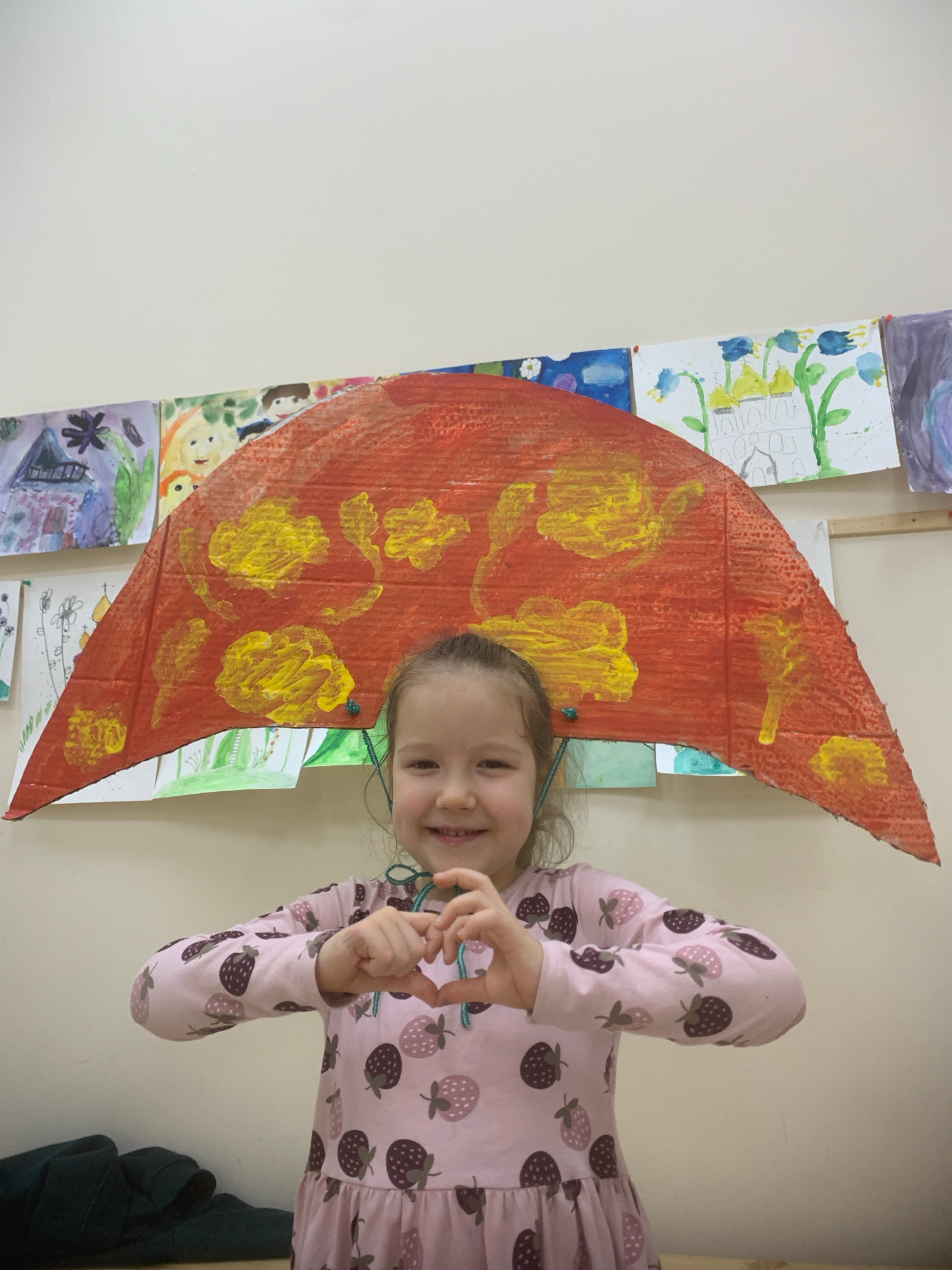 A young girl in a pink dress with strawberry patterns stands smiling, making a heart shape with her hands. She is positioned behind a large, orange, painted cardboard wing, seemingly attached to the w…read more