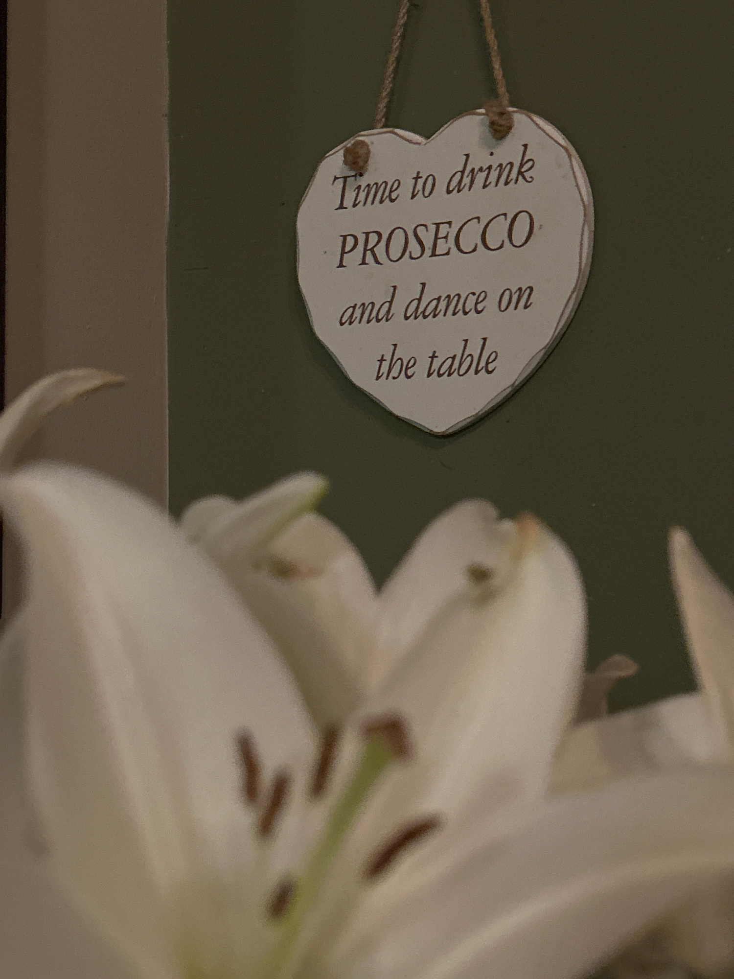 The image shows a heart-shaped sign hanging on a green surface. The sign reads, "Time to drink PROSECCO and dance on the table." The sign is attached with rope, which is also visible. A blurred white…read more